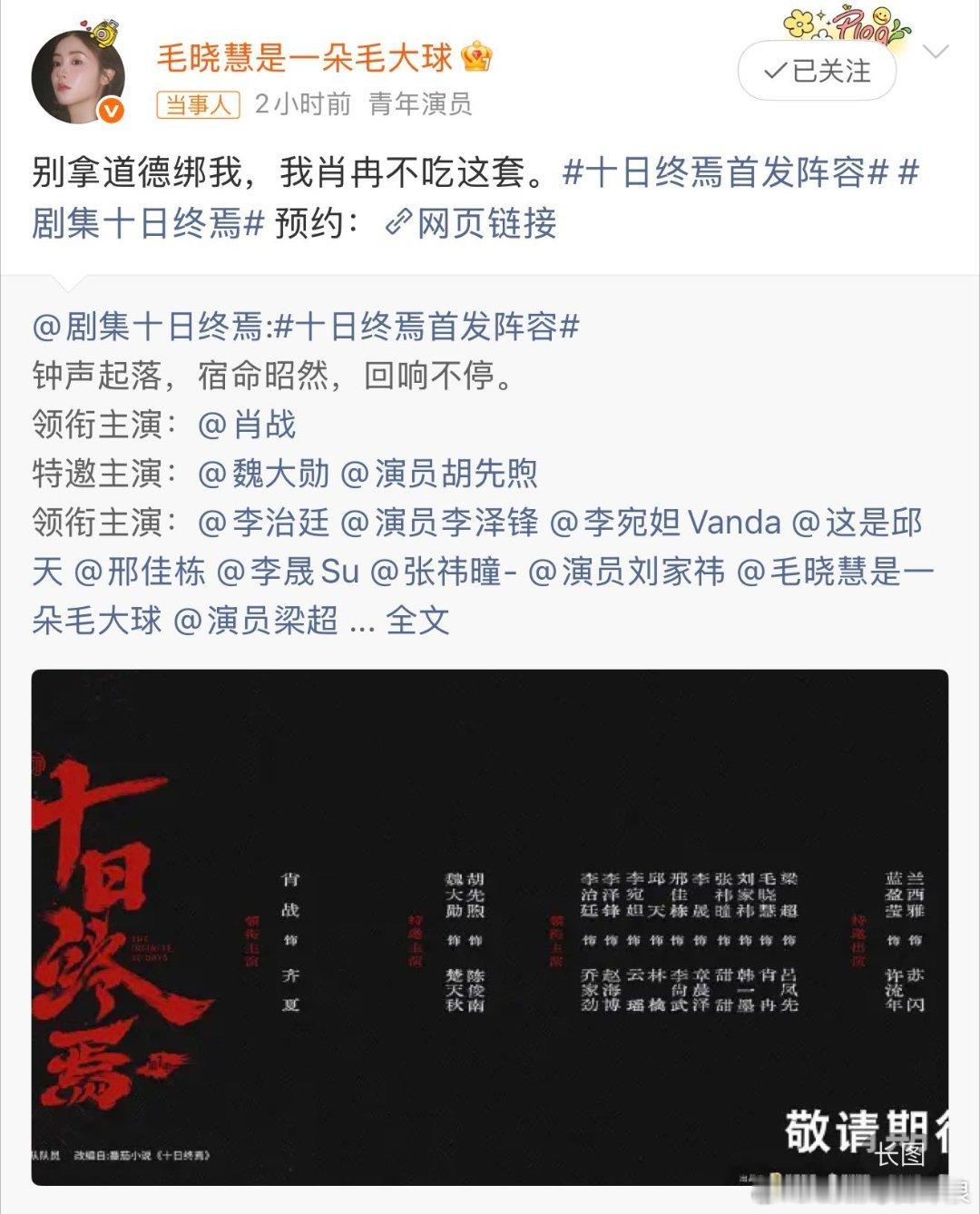 毛晓慧回应十日终焉演肖冉 毛晓慧领衔主演十日终焉毛晓慧演肖冉转型走恶女赛道太合适,谁还记得去年狐妖王权里的女纣王男妲己!姐狗感拉满,千夏女王古丽赞超A的,这次十日终焉要演肖冉了好期待他的表现,听说也是一个恶女角色,美女找到了自己适合的赛道,燥候!