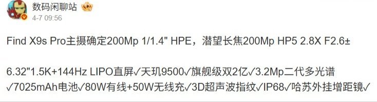 据博主 数码闲聊站 此前爆料,这款新机配备 6.32 英寸 1.5K+144Hz LIPO 直屏,搭载天玑 9500 处理器、7025mAh 电池、80W 有线 +50W 无线充、3D 超声波指纹、IP68 级防尘防水。
