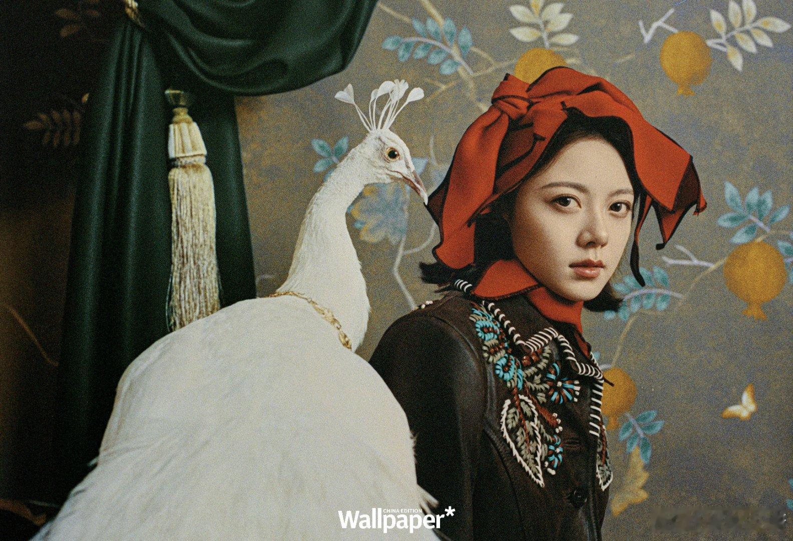 黑纱剪裁晨昏光影,指尖轻叩沉默诗行📖。孔雀衔来鎏金岁月,衣袂漫卷几何梦境。红帽与白鸟共舞,在色彩迷宫种下沉思的树。赵今麦Wallpaper中文版四月刊封面