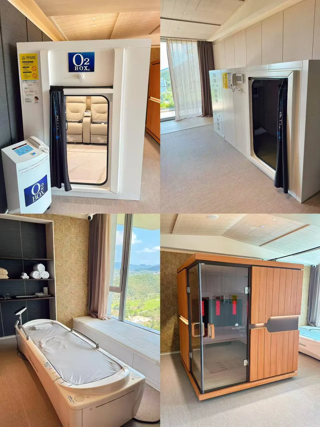 在这里真的太治愈了!清晨在山林里做呼吸冥想,下午去体验了微高压氧舱和水压按摩床,出来后可以去露天泳池游个泳,傍晚对着晚霞练瑜伽,晚上再来一场铜锣浴…身心像被重新整理了一遍!晚上回房间在浴缸泡个澡,一下子泡走了所有疲惫!!!