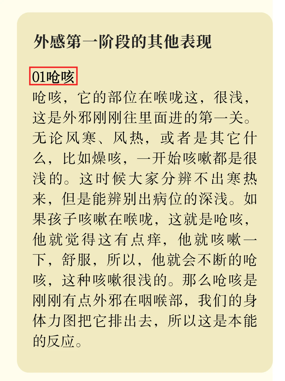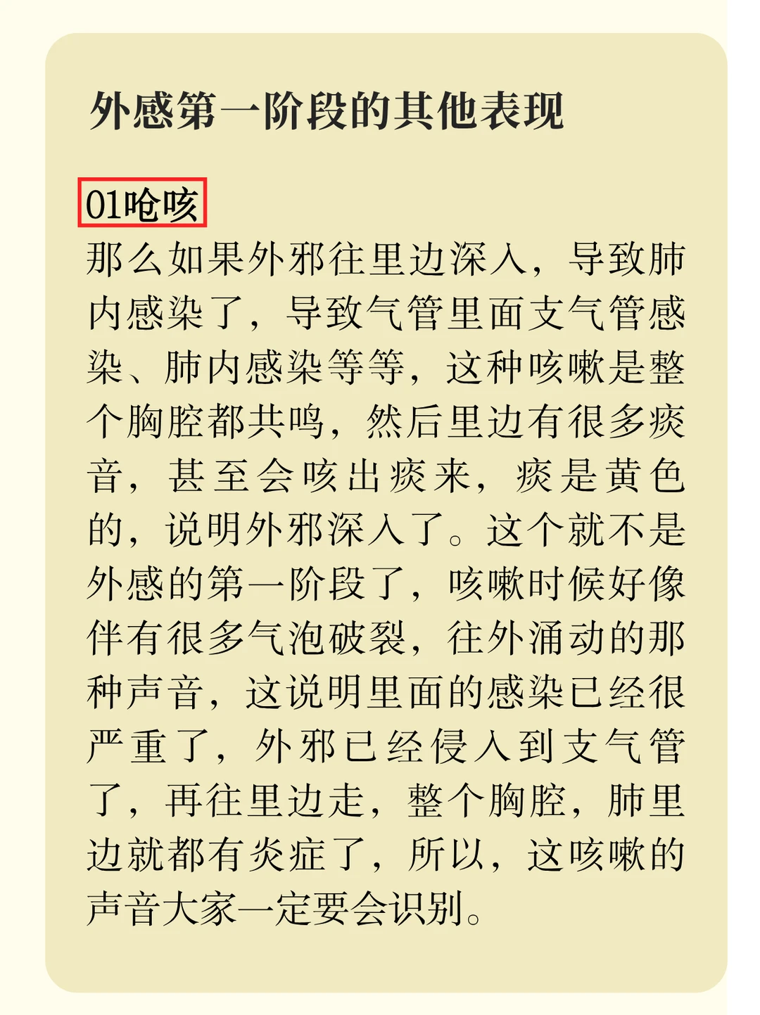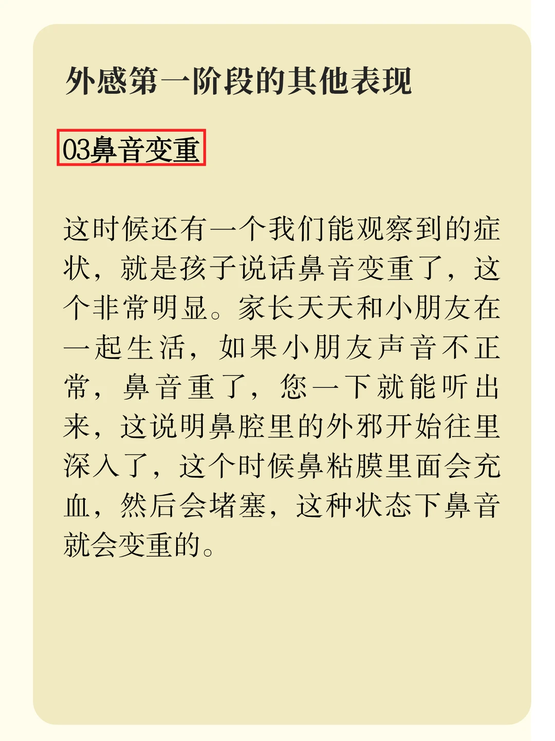 外感在第一阶段还会有其他表现,例如呛咳、怕冷、鼻音变重,具体的描述,给大家贴在图片里了,大家可以左滑翻阅一下。