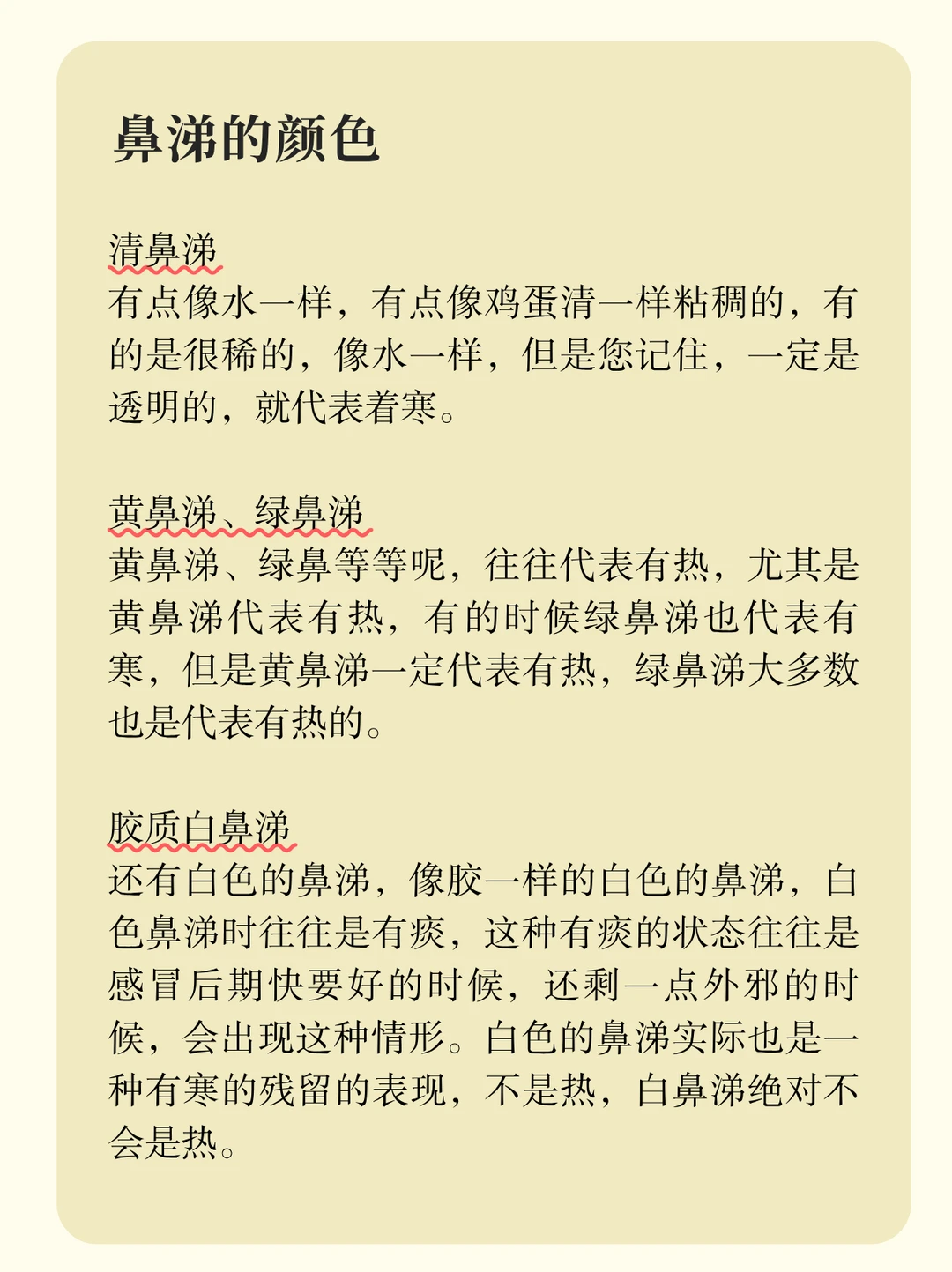 [向右R]像鸡蛋清一样的清鼻涕是有寒,黄鼻涕和绿鼻涕是有热,白色的鼻涕又是回到有寒剩一点邪气的这种状态。