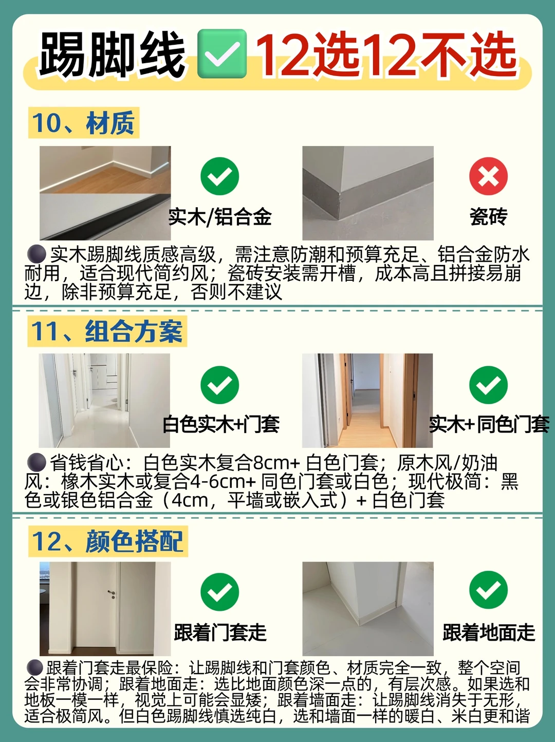 ⑩材质:实木踢脚线质感高级,需注意防潮和预算充足、铝合金防水耐用,适合现代简约风;瓷砖安装需开槽,成本高且拼接易崩边,除非预算充足,否则不建议