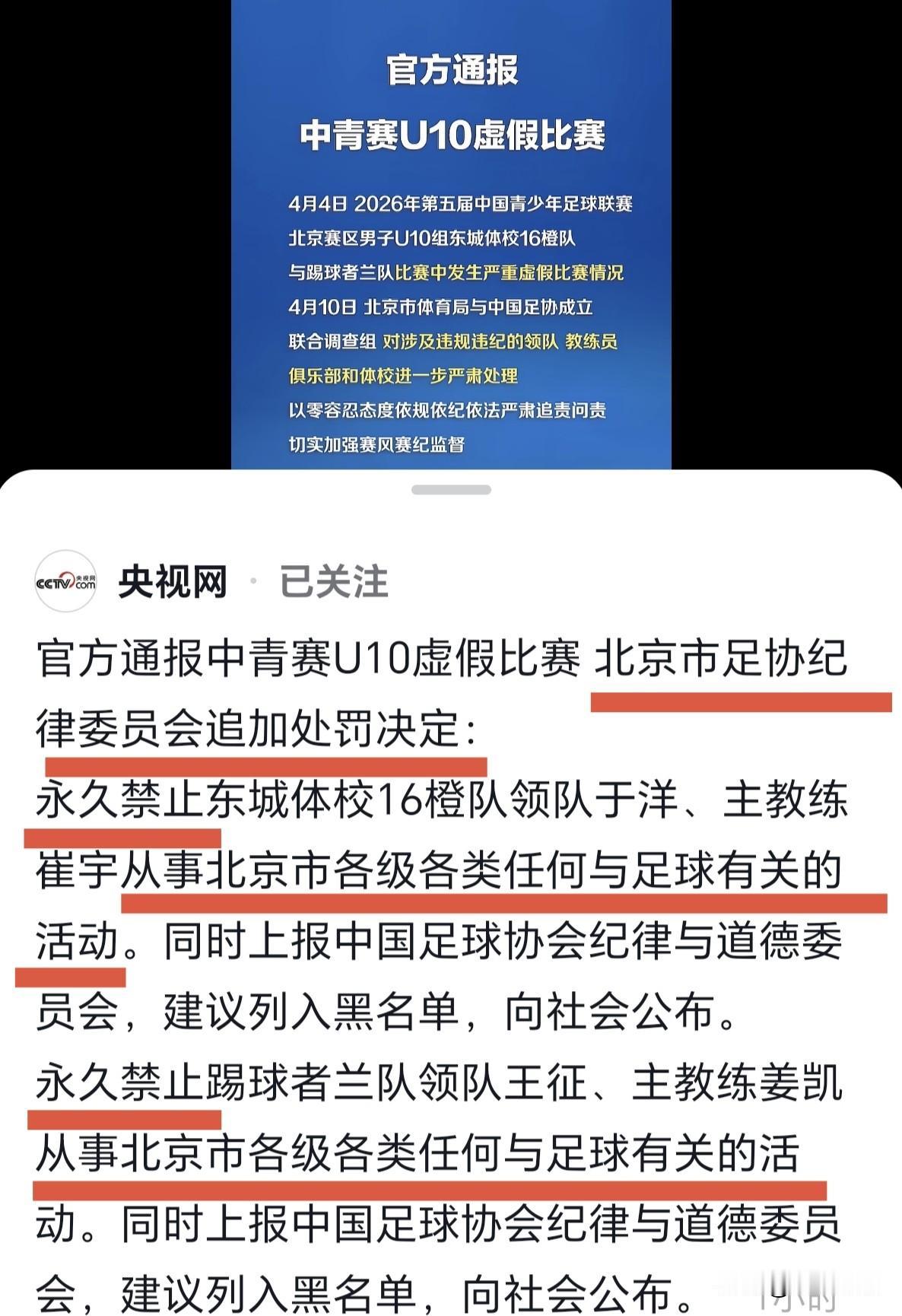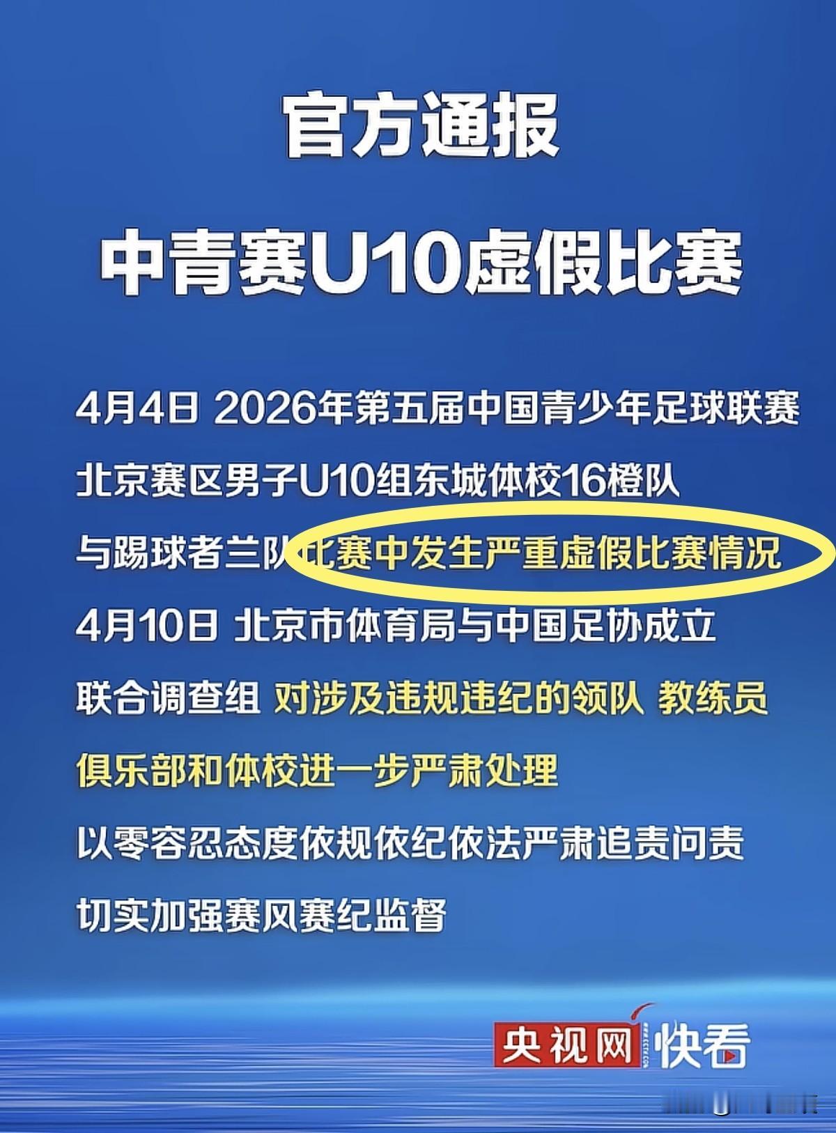 北京时间4月10日下午,央视网正式报道了中青赛北京赛区U10虚假比赛,看看通报中的措辞,就知道问题的严重性了:发生严重虚假比赛情况[吃瓜群众]