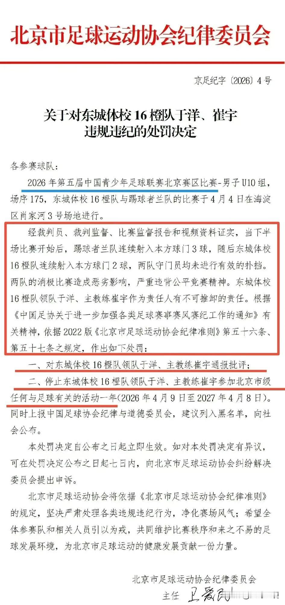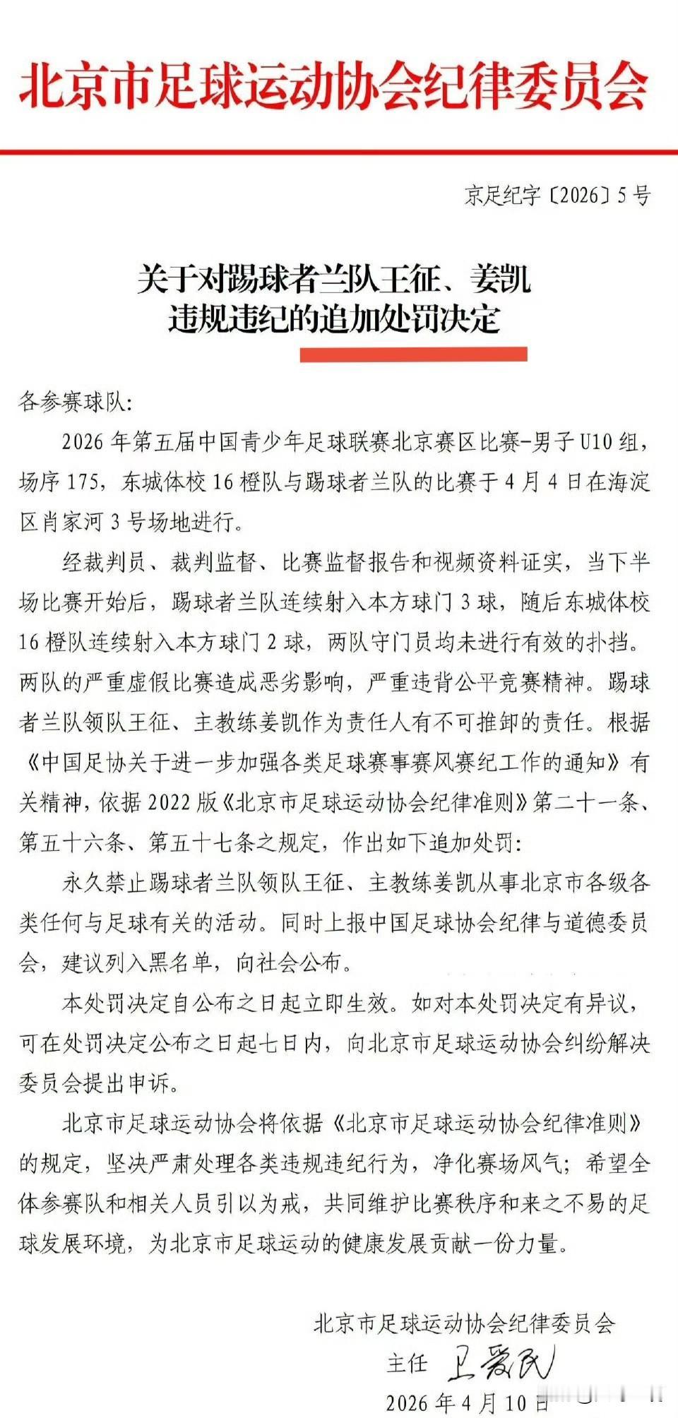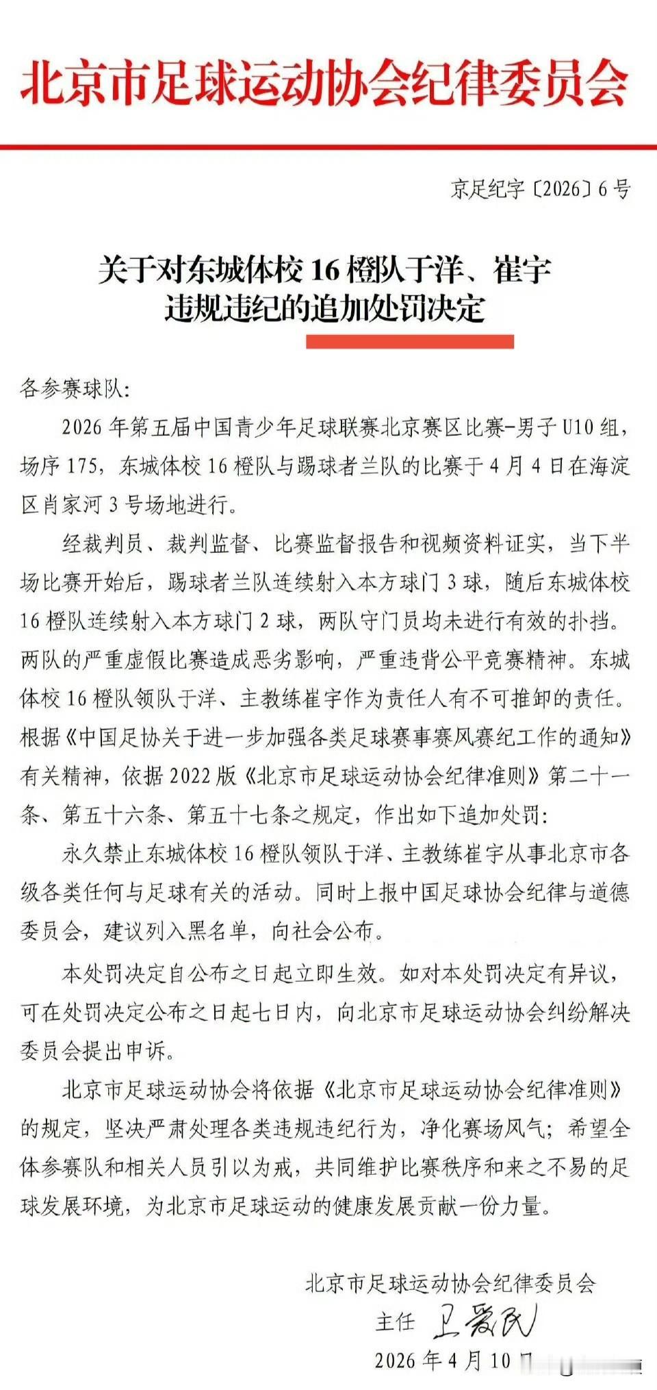 虽然北京足协对参与虚假比赛的两队的主教练和领队进行了追加处罚,目前关于两队的主教练和领队的处罚,从北京足协的一年禁赛,追加到北京足协的永久禁赛[震惊]