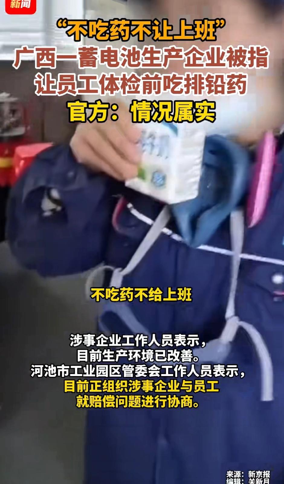 不吃药不让上班,广西一蓄电池生产企业被指让员工体检前吃排铅药,广西这蓄电池生产企业真是离谱到家了!要求员工体检前吃排铅药,不吃还不让上班。要知道,蓄电池生产本就是铅危害高发行业,员工血铅超标或中毒危害极大,有的工友都头晕腹痛了。可因为吃了药,体检数据根本达不到职业病工伤标准。
