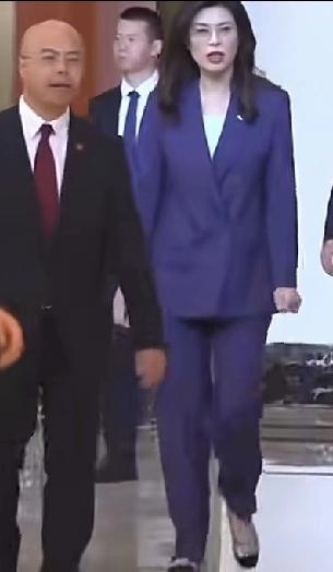 郑丽文今天穿的西装是蓝紫色,走路带风、稳重端庄,还有点帅气。