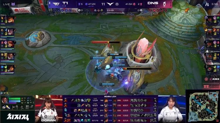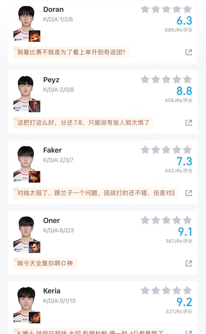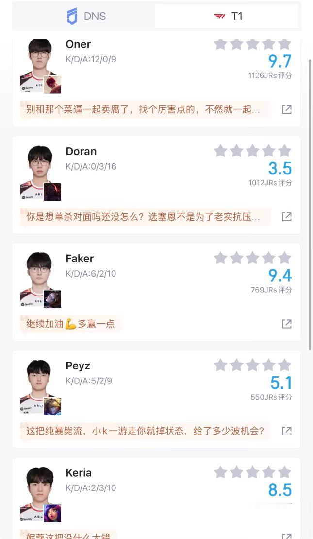 刚看完T1打DNS 2-0拿下了 但多兰真的笑死我 玩个塞恩能被格温单杀两回就离谱 我看弹幕都快骂疯了 说他是RJ要不是Oner盲僧12杀硬carry这把真要翻车 了