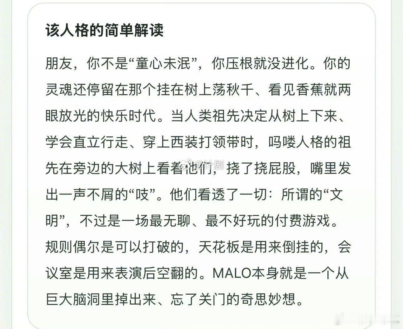 徐若晗的sbti是malo 吗喽型人格的徐若晗也太真实了,就是那种不会想太多但会突然冒出一个奇怪想法的类型。桃花坞录制碎片里她那个状态,跟malo这个标签简直天造地设的一对。