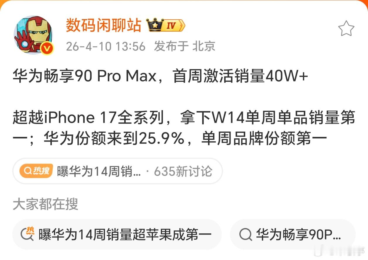 太恐怖了,虽然有喷子抹黑,但W14周畅享90 Pro Max助力华为拿下了25.91%份额,直接超越苹果!这确实卖爆了~ 曝华为14周销量超苹果成第一