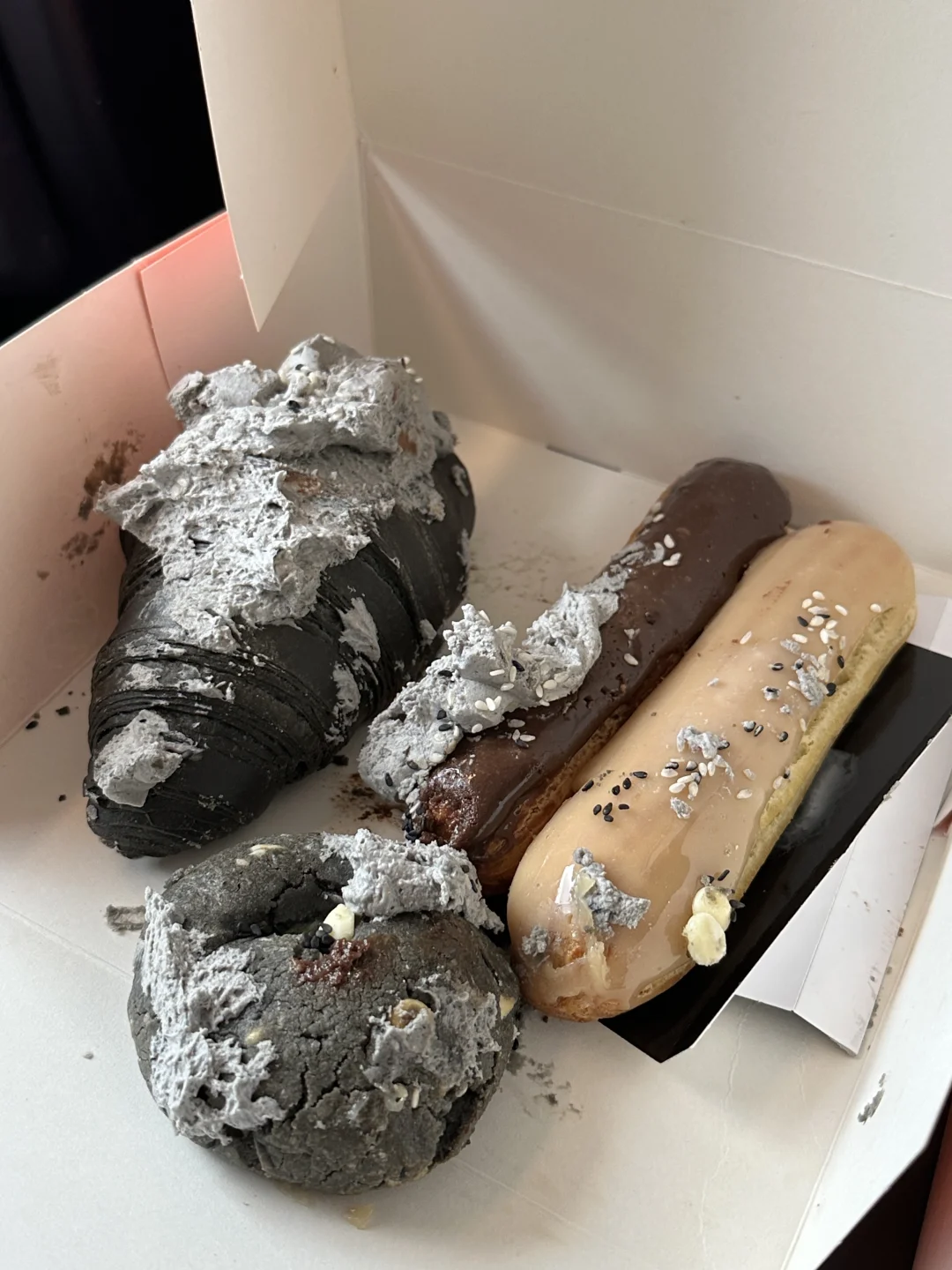 周日大排长队的面包房,闪电泡芙一般般。买了几款和黑芝麻相关的甜点,不论是黑芝麻羊角还是黑芝麻抹茶曲奇,黑芝麻的内陷感觉很浓稠,有种在吃芝麻糊的感觉…我会更喜欢Moon Croissant家的黑芝麻。