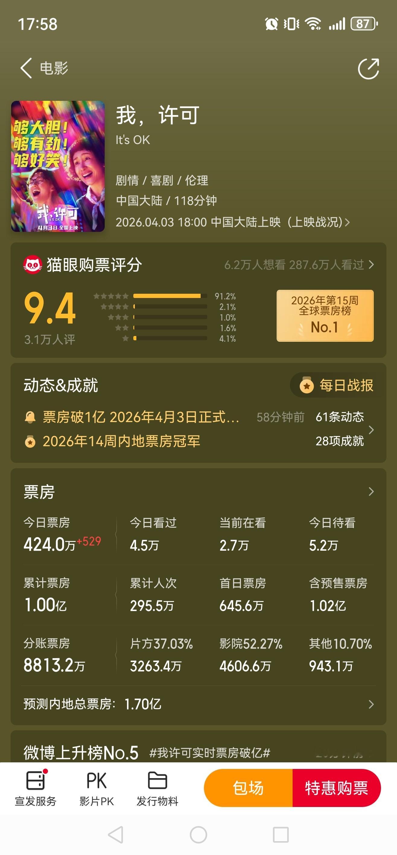 此外,《我,许可》的点映时间够长(3月21日开启点映,相当于提前2周就能看到了),排片场次随着口碑发酵也稳步增加,最终清明档结束后在稍冷的档期成为更多观众观影首选~
