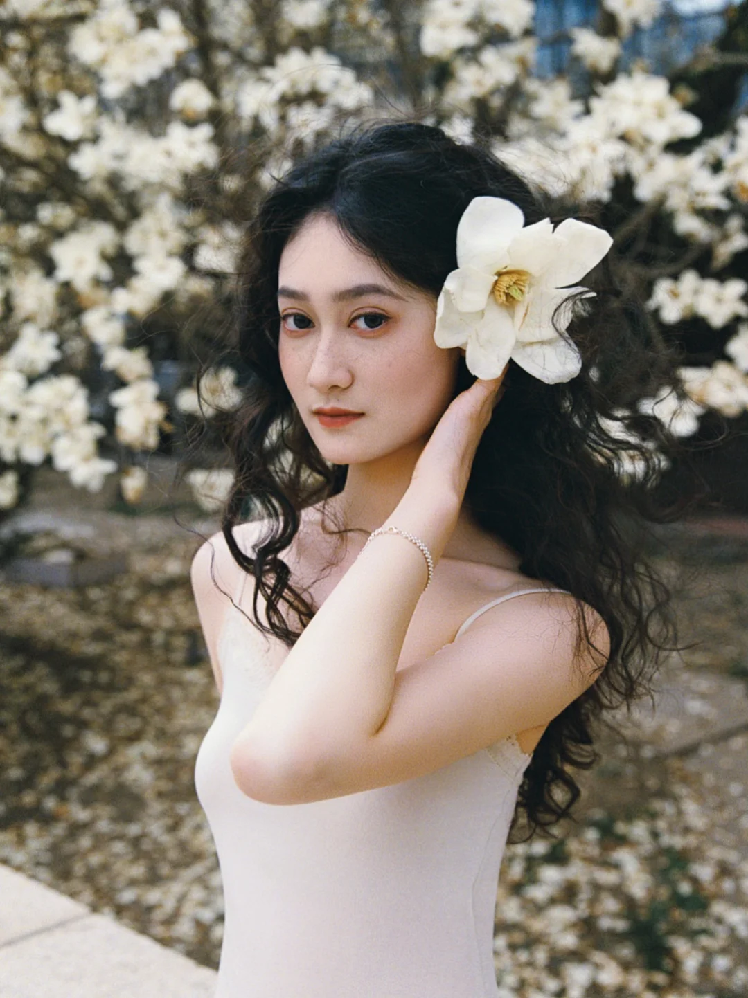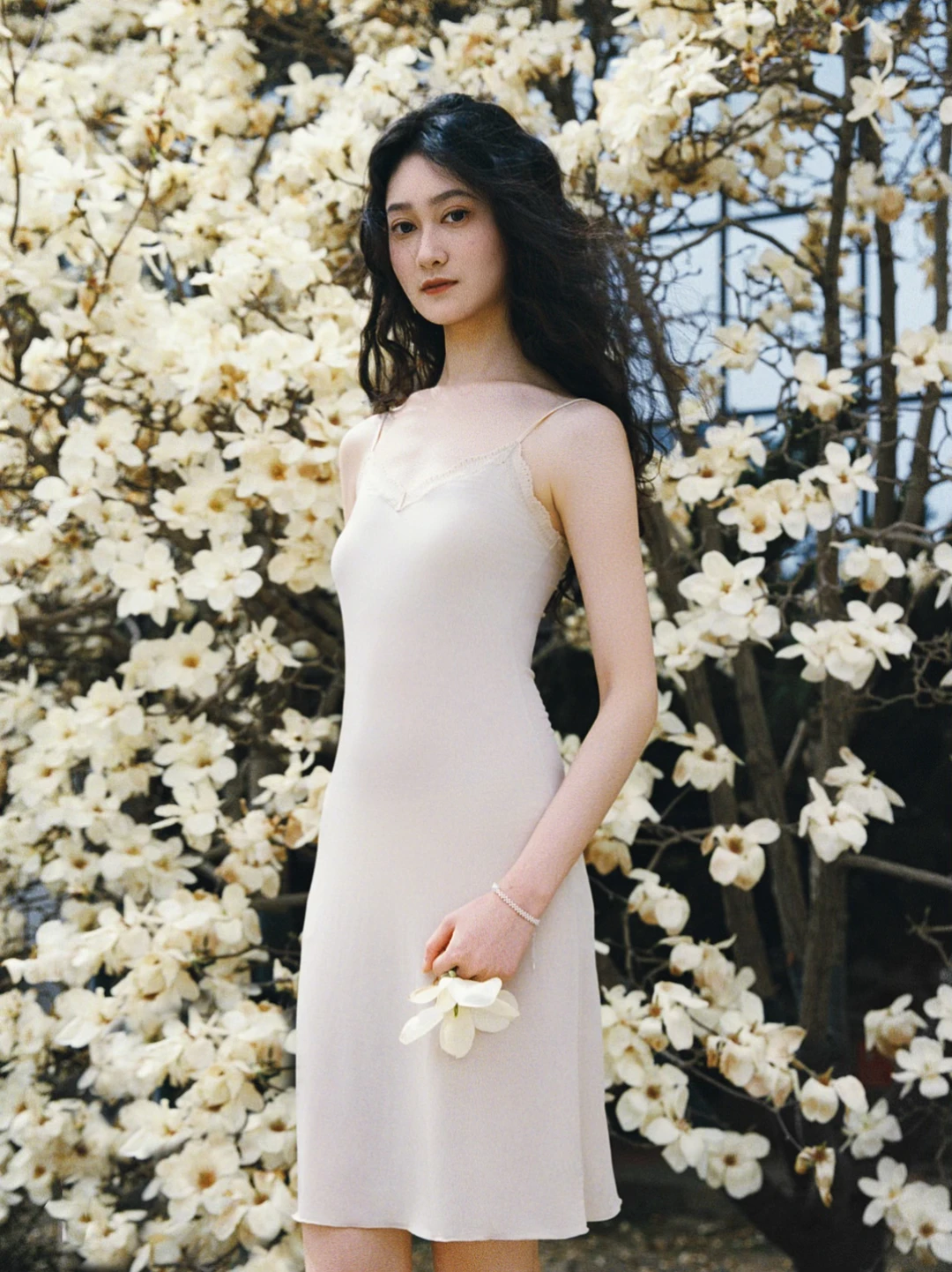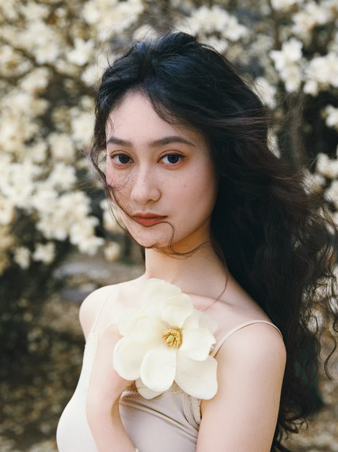 那天她刚洗完澡,长发湿漉漉地披在肩上,穿着简单的白裙子,从澡堂门口走出来的时候,刚好迎着春日的阳光,整个人都发着光。我没忍住上前搭话,问她能不能来玉兰花下拍一组照片,她笑着就答应了。