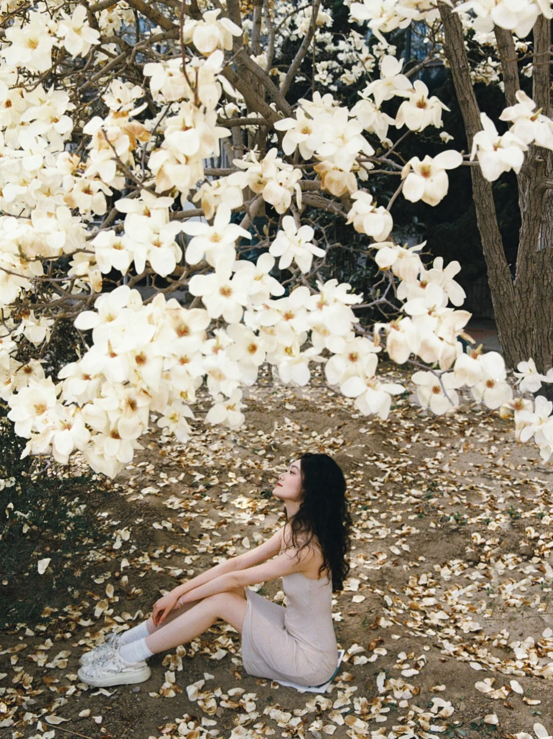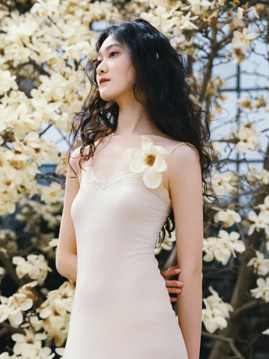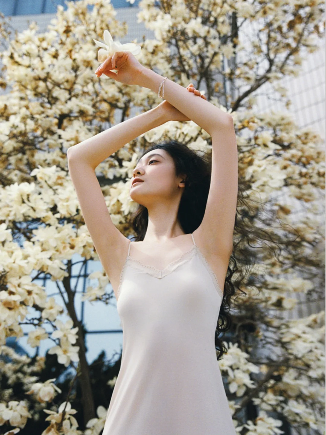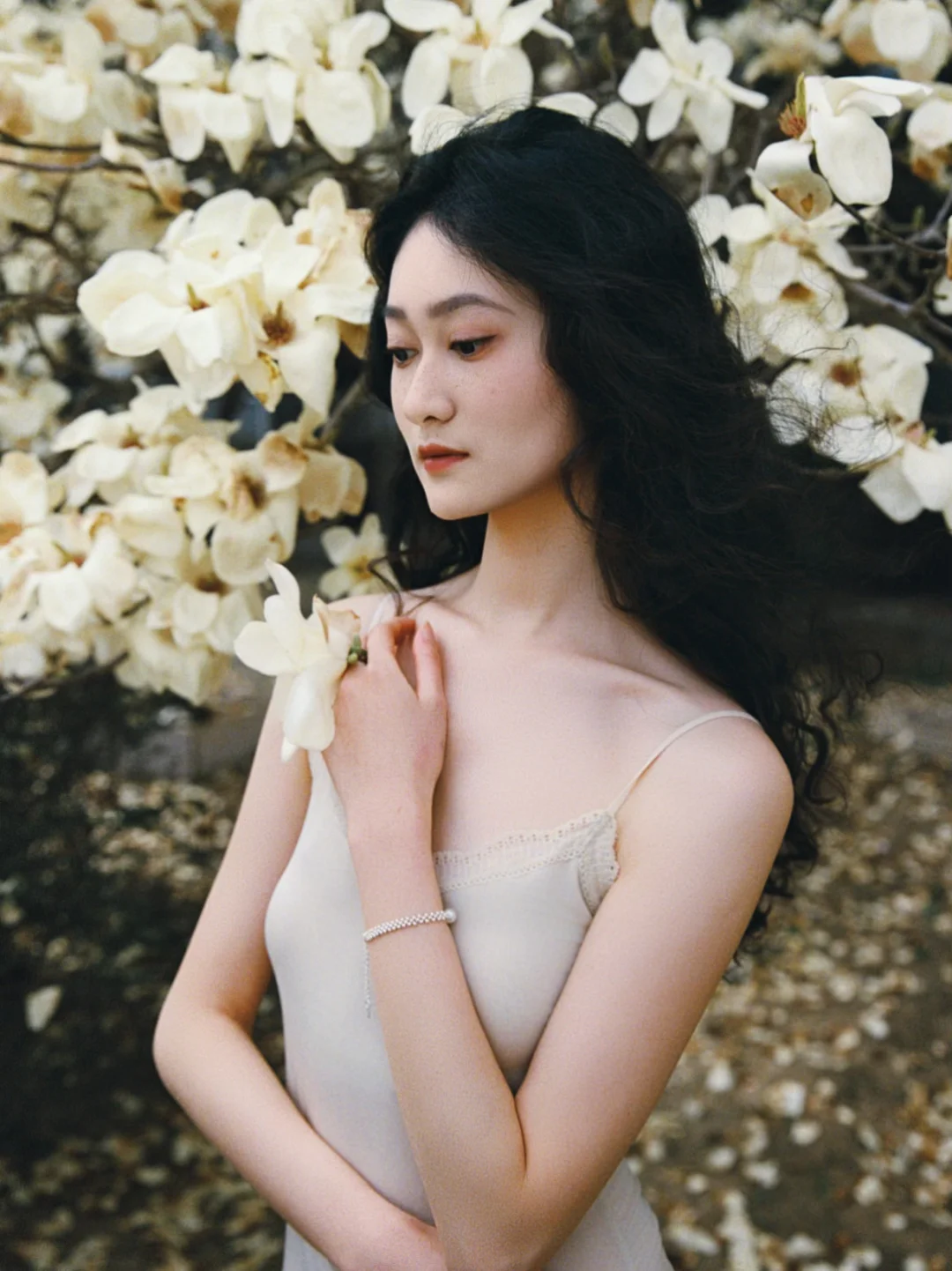 那天她刚洗完澡,长发湿漉漉地披在肩上,穿着简单的白裙子,从澡堂门口走出来的时候,刚好迎着春日的阳光,整个人都发着光。我没忍住上前搭话,问她能不能来玉兰花下拍一组照片,她笑着就答应了。