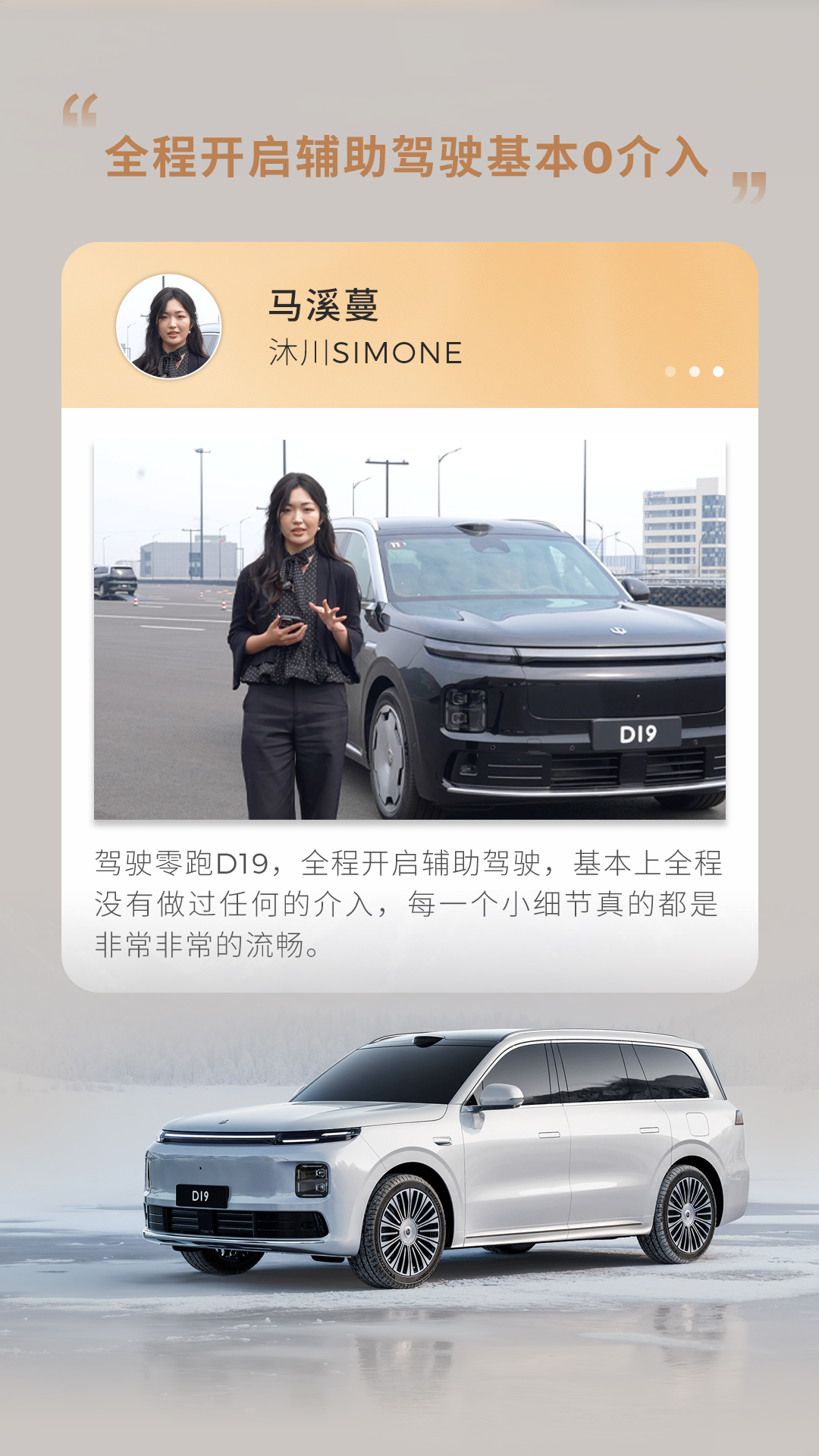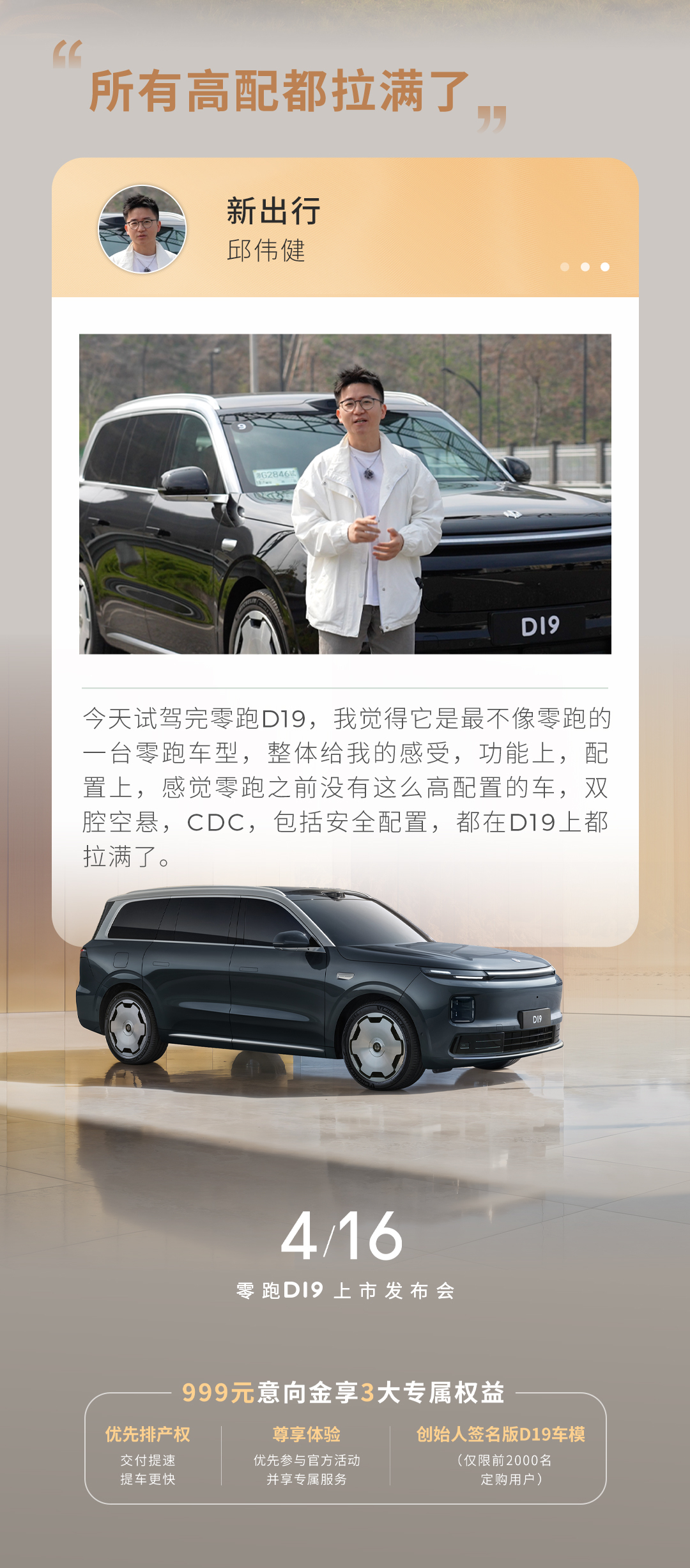零跑D19 为何与众不同?驾控质感、安全实力、辅助驾驶又迎来了哪些全新进阶?正式上市前,零跑特邀专业媒体抢先实测!点击下图,跟着,从专业视角解锁真实的用车体验!更多精彩,4月16日上市发布会见!盲订进行中,999元意向金可解锁三重权益网页链接零跑汽车