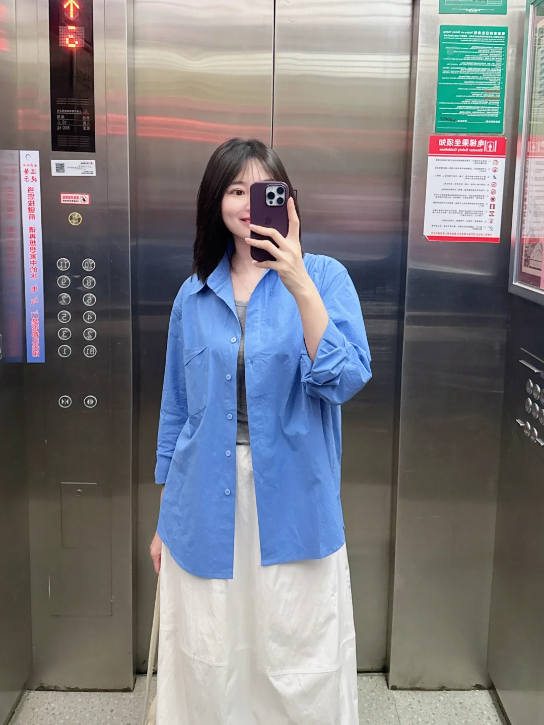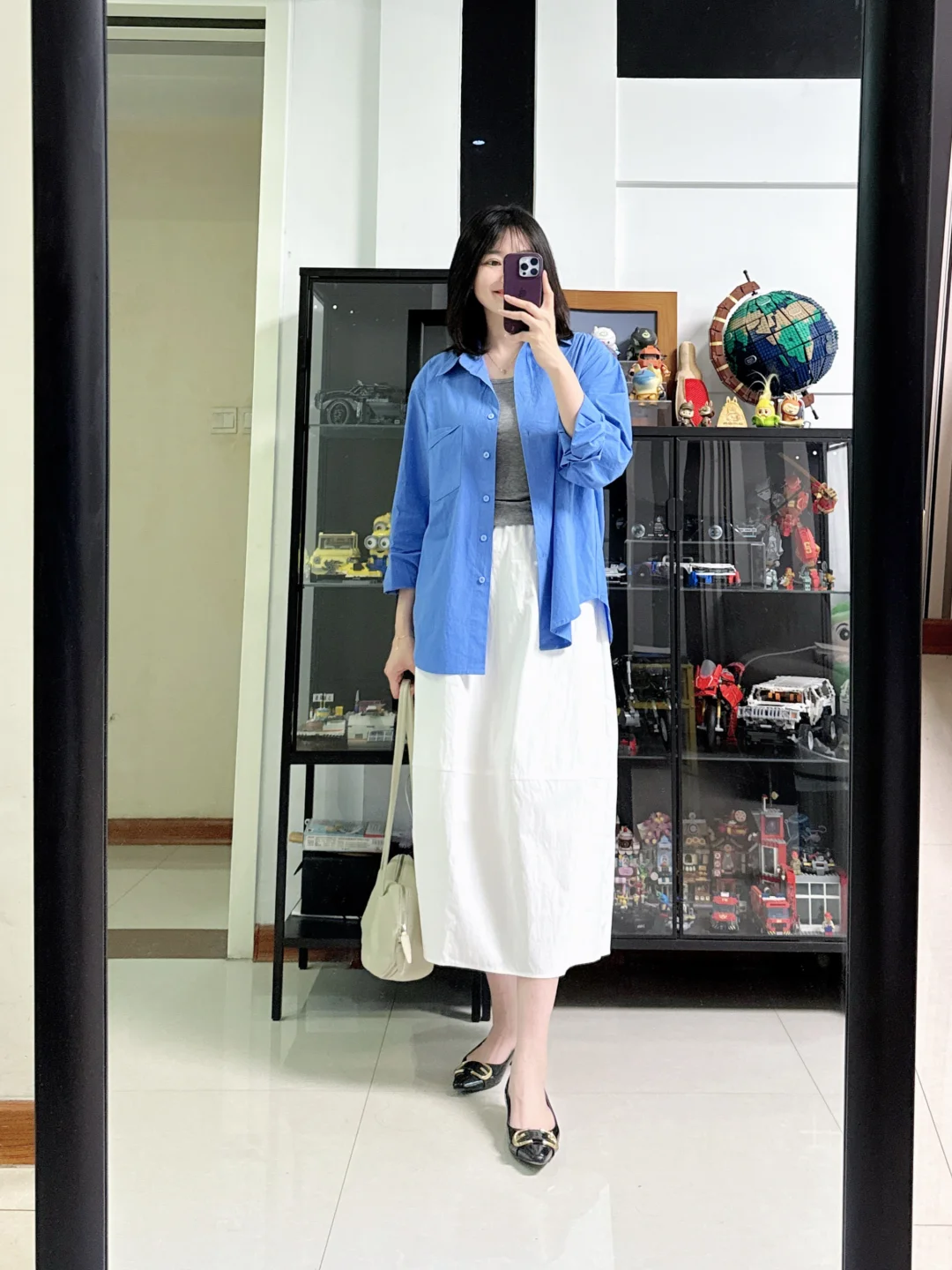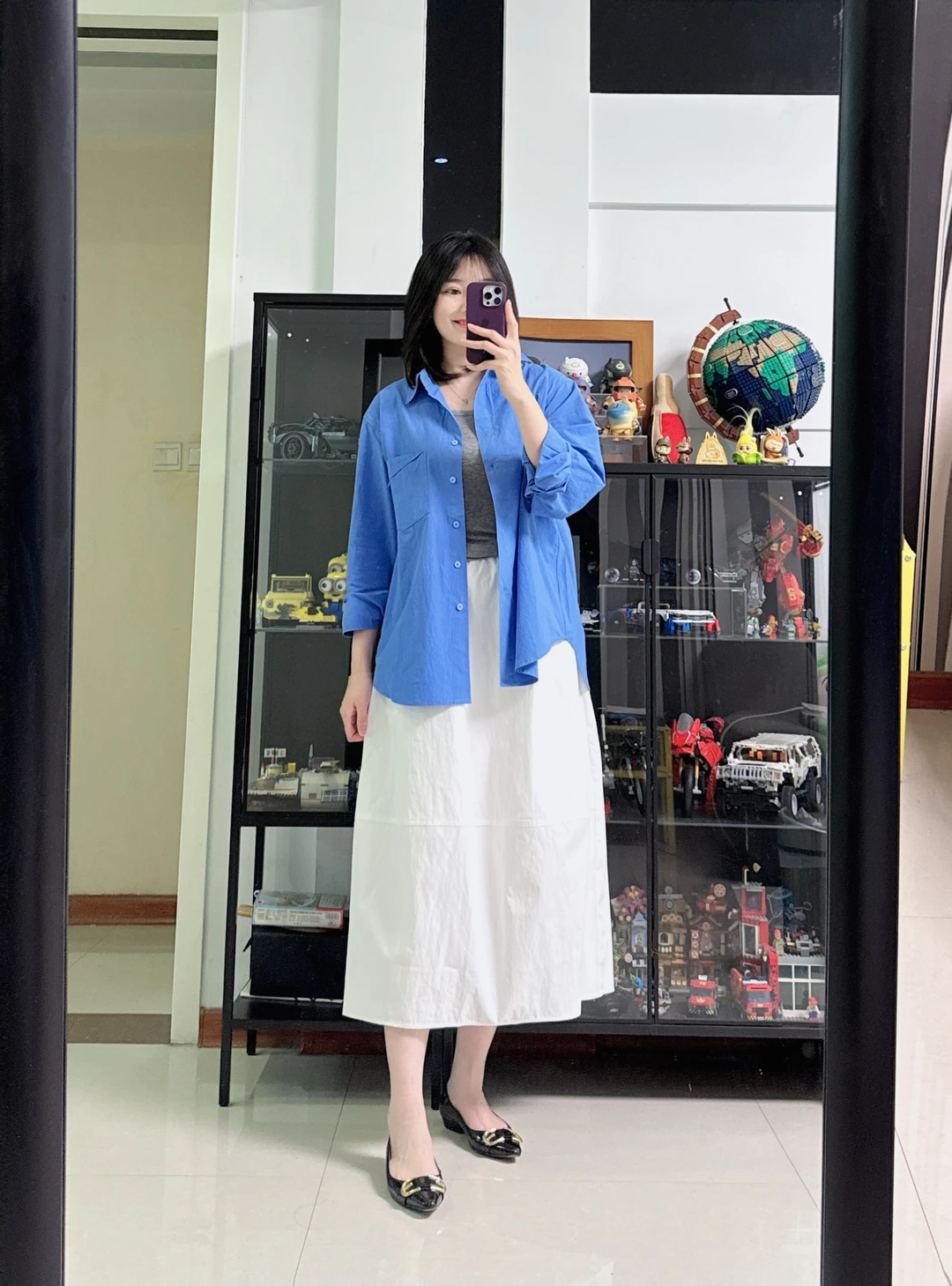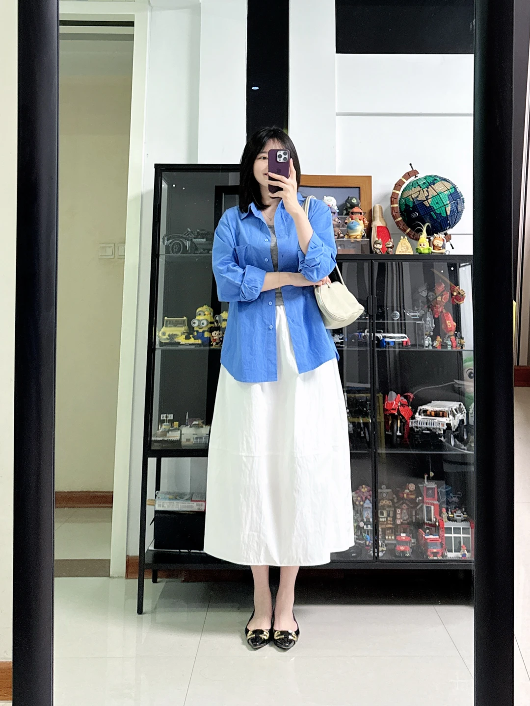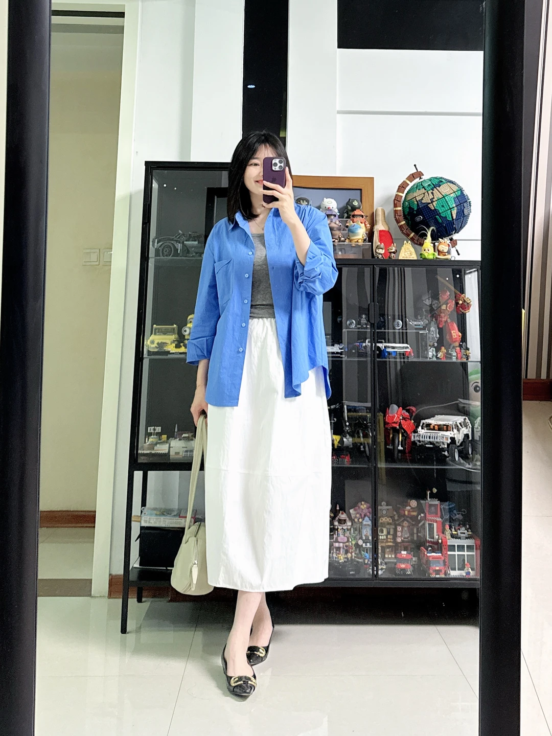 今日穿搭:蓝色衬衫当外套穿,内搭灰色T恤白色半裙,日常通勤休闲都可以。