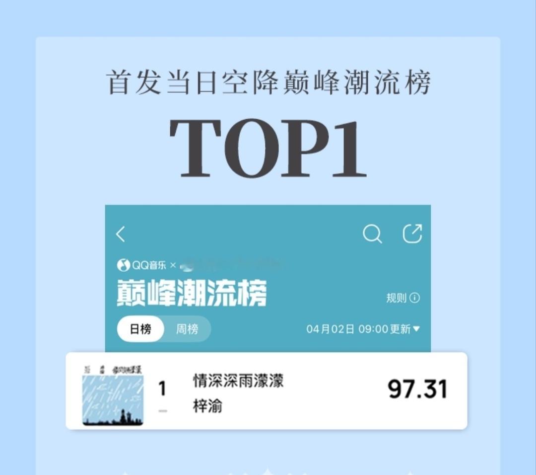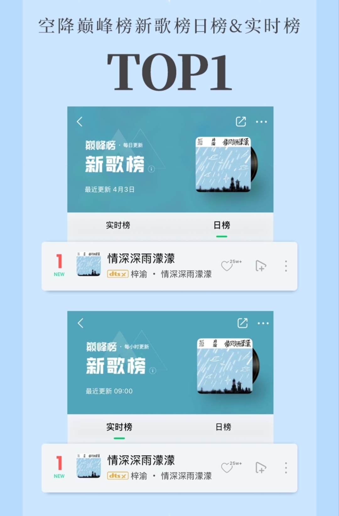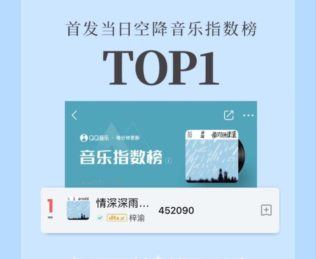 空降巅峰榜新歌榜日榜&实时榜TOP1!首发当日空降巅峰潮流榜TOP1!首发当日空降音乐指数榜+评论人气榜+在听热度榜TOP1!巅峰榜飙升榜+热歌榜+流行指数榜+腾讯音乐由你榜周榜&日榜TOP1!好亮眼的成绩!梓渝新歌九榜第一