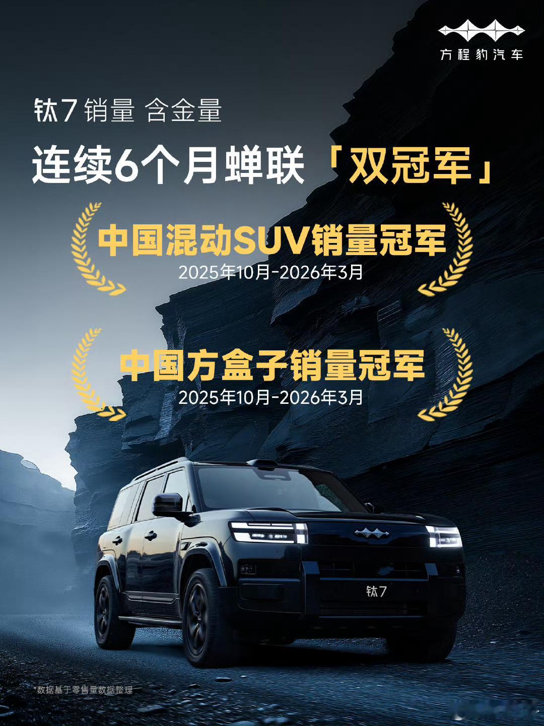 大v聊车 太猛了,方程豹钛7在2025年10月-2026年3月,连续6个月包揽国内混动SUV、方盒子SUV双品类销量冠军。