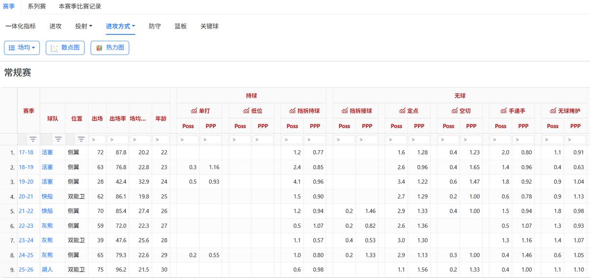 在活塞三个赛季,肯纳德用的最多的得分方式是单打和挡拆持球,那个时候他也投定点三分,但有/无球得分占比是五五开。离开活塞肯纳德5个赛季换了3支球队,但他从未放弃持球进攻,只不过定点得分占比逐步提升。这才给人一种“肯纳德是投手”的错觉。