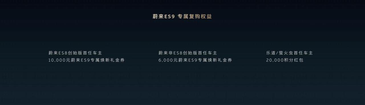4 月 9 日杭州,蔚来 ES9 正式发布并开启预售,行政豪华版 52.8 万起 / BaaS 42 万起;行政签名版 58.8 万起 / BaaS 48 万起;地平线特别版 65.8 万起 / BaaS 55 万起。4 月 9 日起至上市前,5000 元定金抵 10000 元购车款;老用户专享:ES8 创始版首任车主 1 万元焕新券,非创始版 6000 元,乐道 / 萤火虫首任车主 2 万复购积分。