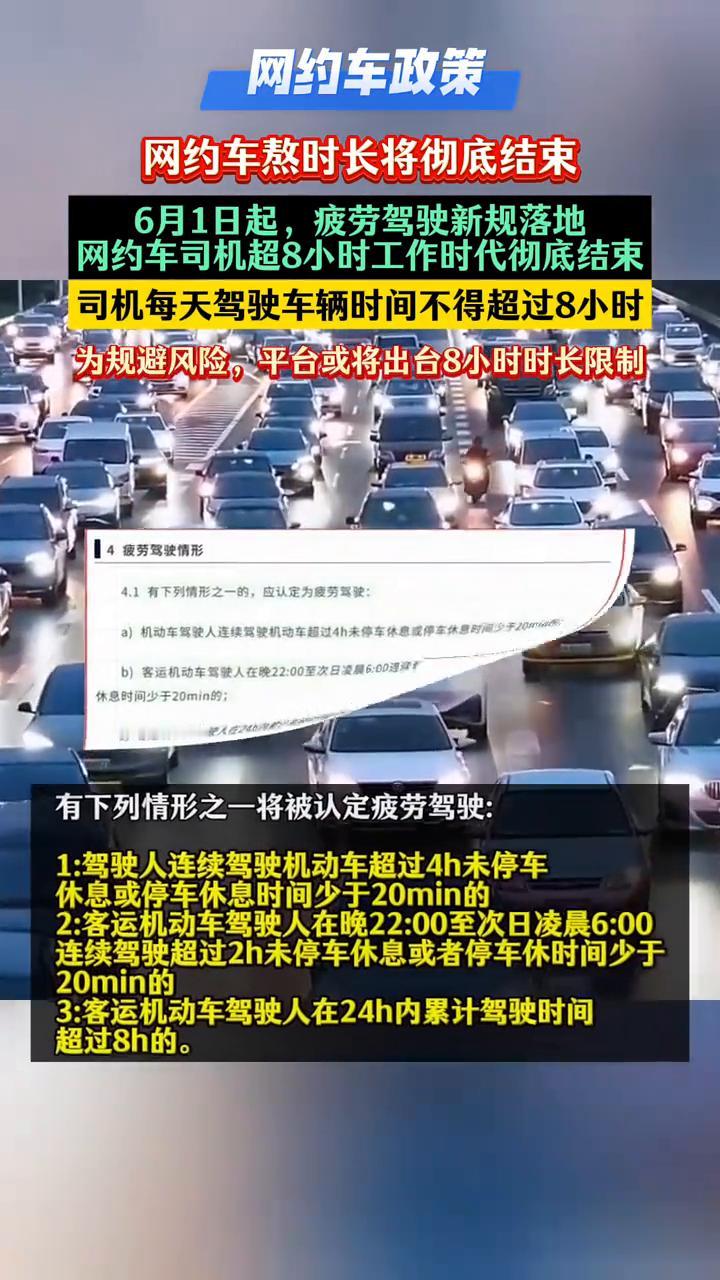 网约车熬时长将彻底结束。 6月1日起,疲劳驾驶新规落地,网约车司机超8小时工作时
