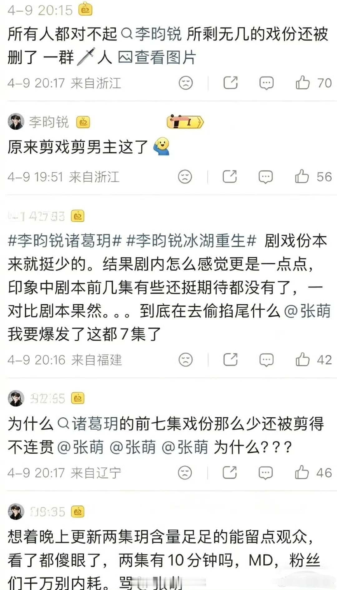 冰湖重生前五集戏份拉表:黄杨钿甜>张康乐>李昀锐 ……张萌说冰湖重生考虑过给黄杨钿甜的角色换演员、换脸等…李昀锐天选古人,张康乐基本功非常扎实。话说 李昀锐戏份这么少吗?戏份时长拉表,粉丝在向张萌维权!瓜主都出来为李昀锐说话了,同时放了影视瓜剑阁闻铃