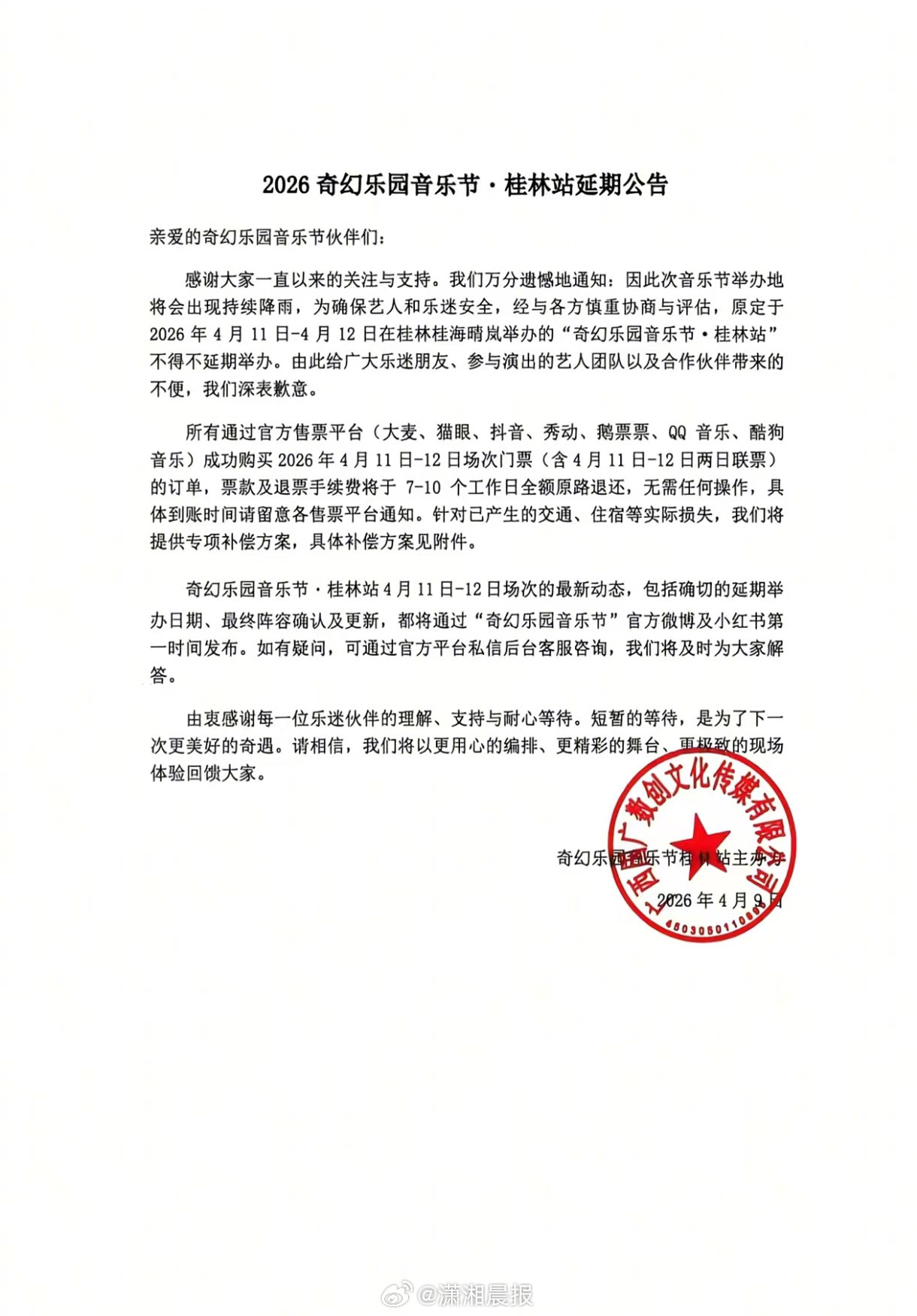 【桂林#一音乐节距开幕仅两天突然通知延期#】#多方回应音乐节开幕前两天突然延期#4月9日,“腾讯音乐人奇幻乐园”音乐节桂林站发布延期公告,原计划4月11日、12日举办的音乐节因持续降雨,为保障艺人和乐迷安全,音乐节延期,公告中称会在酒店、机票等方面进行补偿。