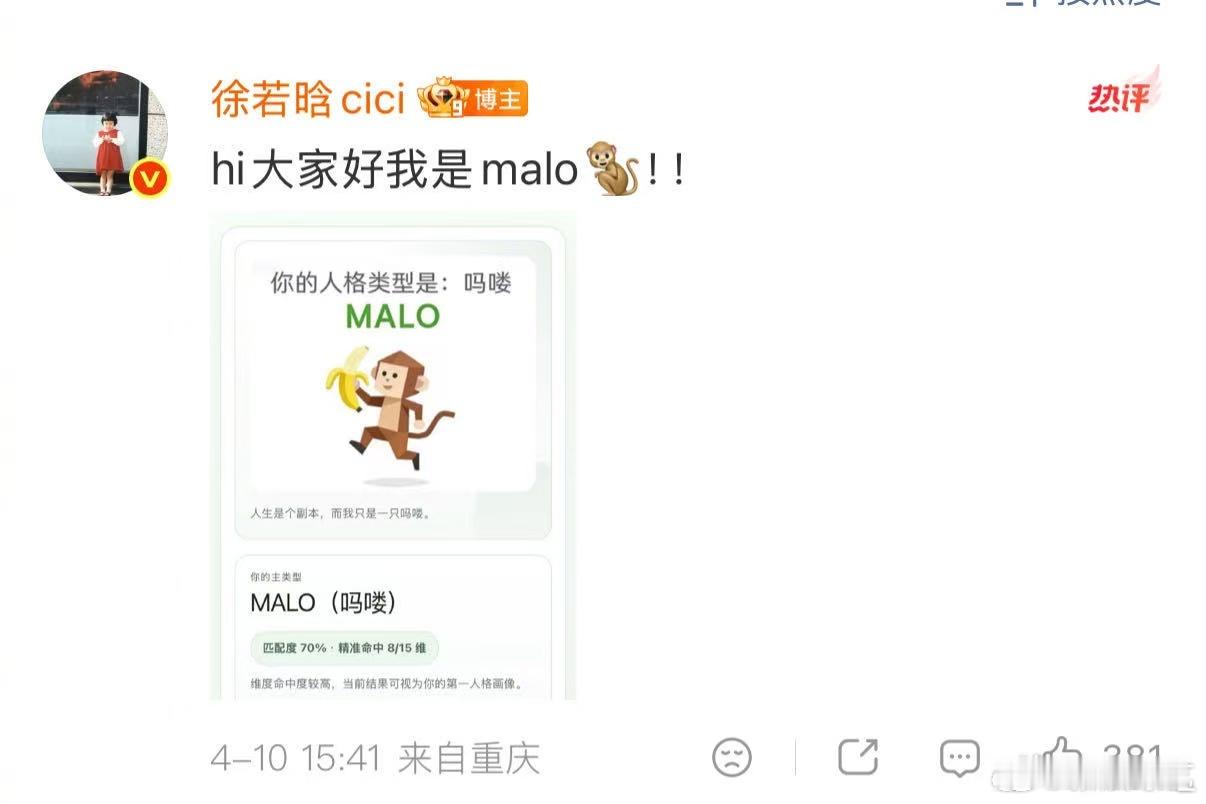 徐若晗的sbti是malo 徐若晗用两个词就把自己说明白了,sbti malo,吗喽型人格。桃花坞录制碎片里她那些出其不意的反应和永远亮着的眼睛,全都指向同一个答案,她是真的快乐小猴。