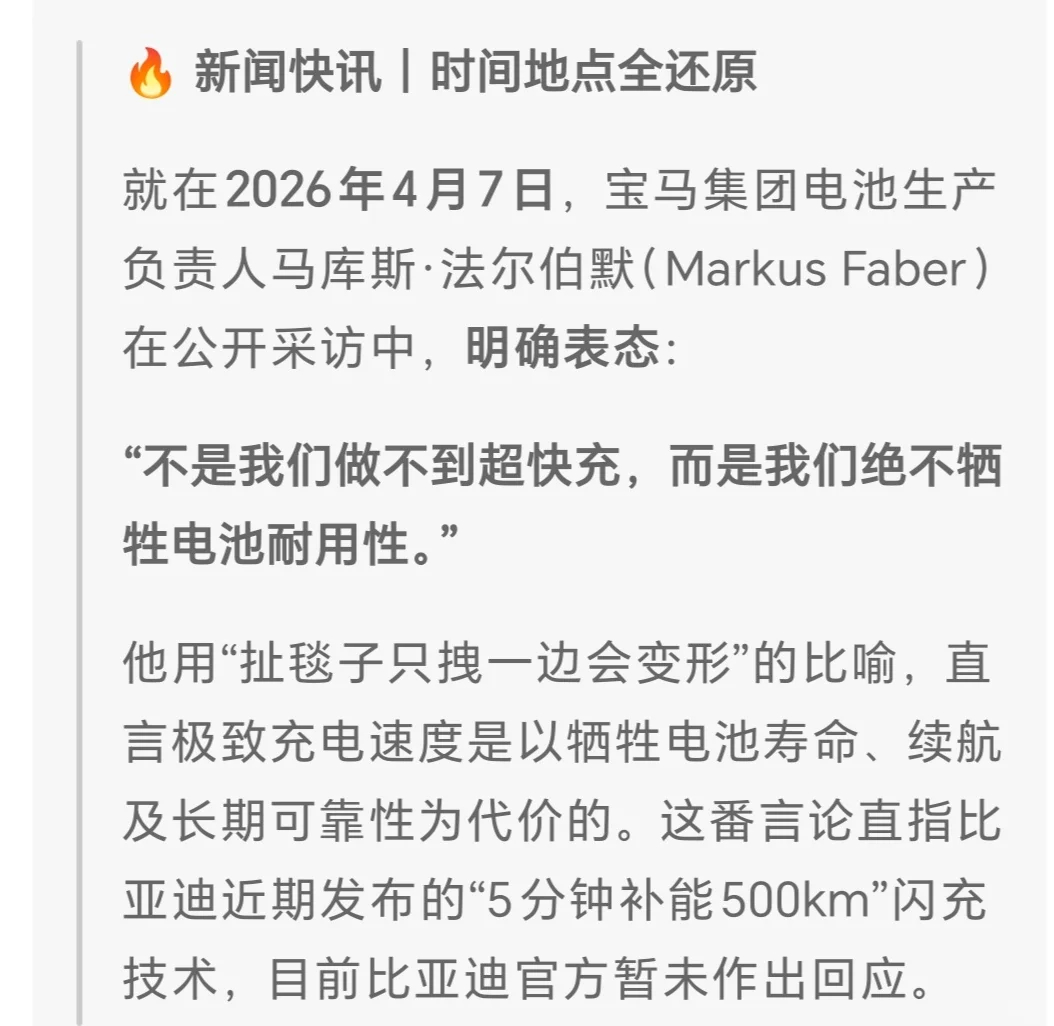 汽车大V聊车 宝马电池负责人公开回应比亚迪新一代闪充技术直言并非做不到超快充只是不愿为追求速度牺牲电池耐用性这番表态直接将两大车企的快充技术之争摆上台面。