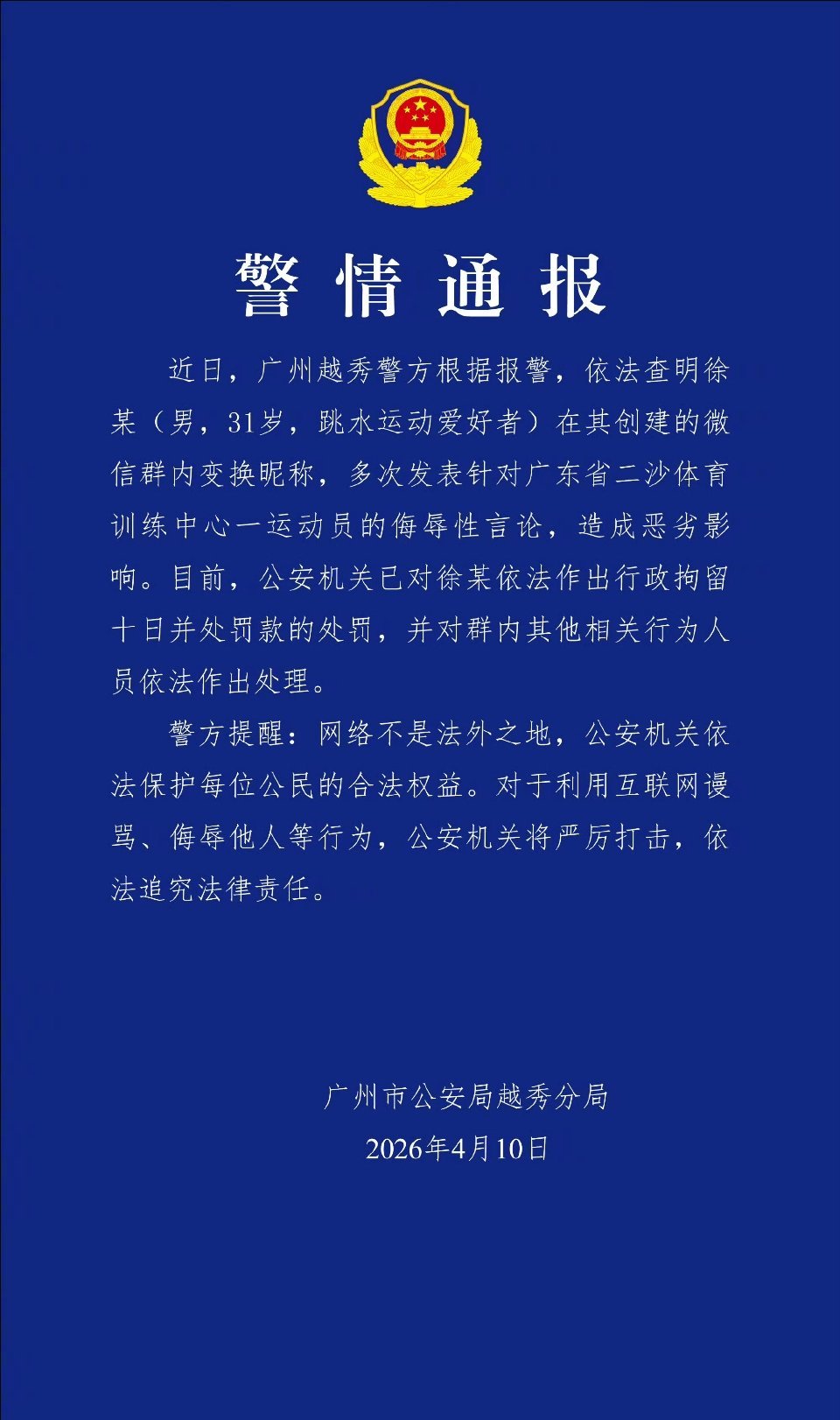 男子微信群多次侮辱全红婵被拘这人是咋想的呢,真是罪有应得。