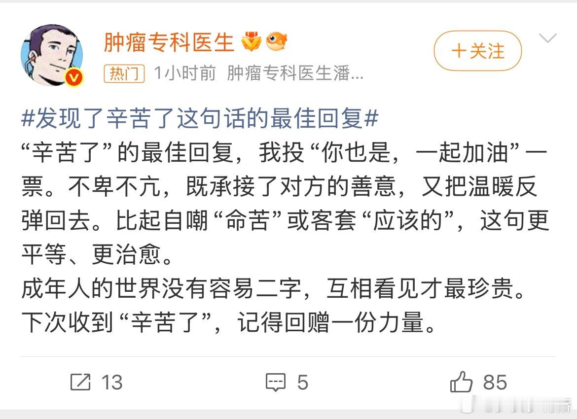 发现了辛苦了这句话的最佳回复辛苦了一般都是上级对下级说的,上级可能也有苦,但应该
