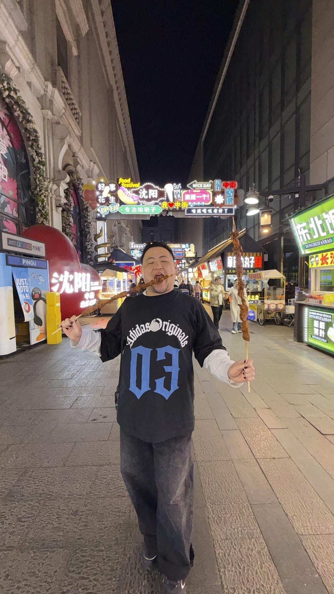 美国华裔男星 Joella 回中国沈阳旅游,吃羊肉串。