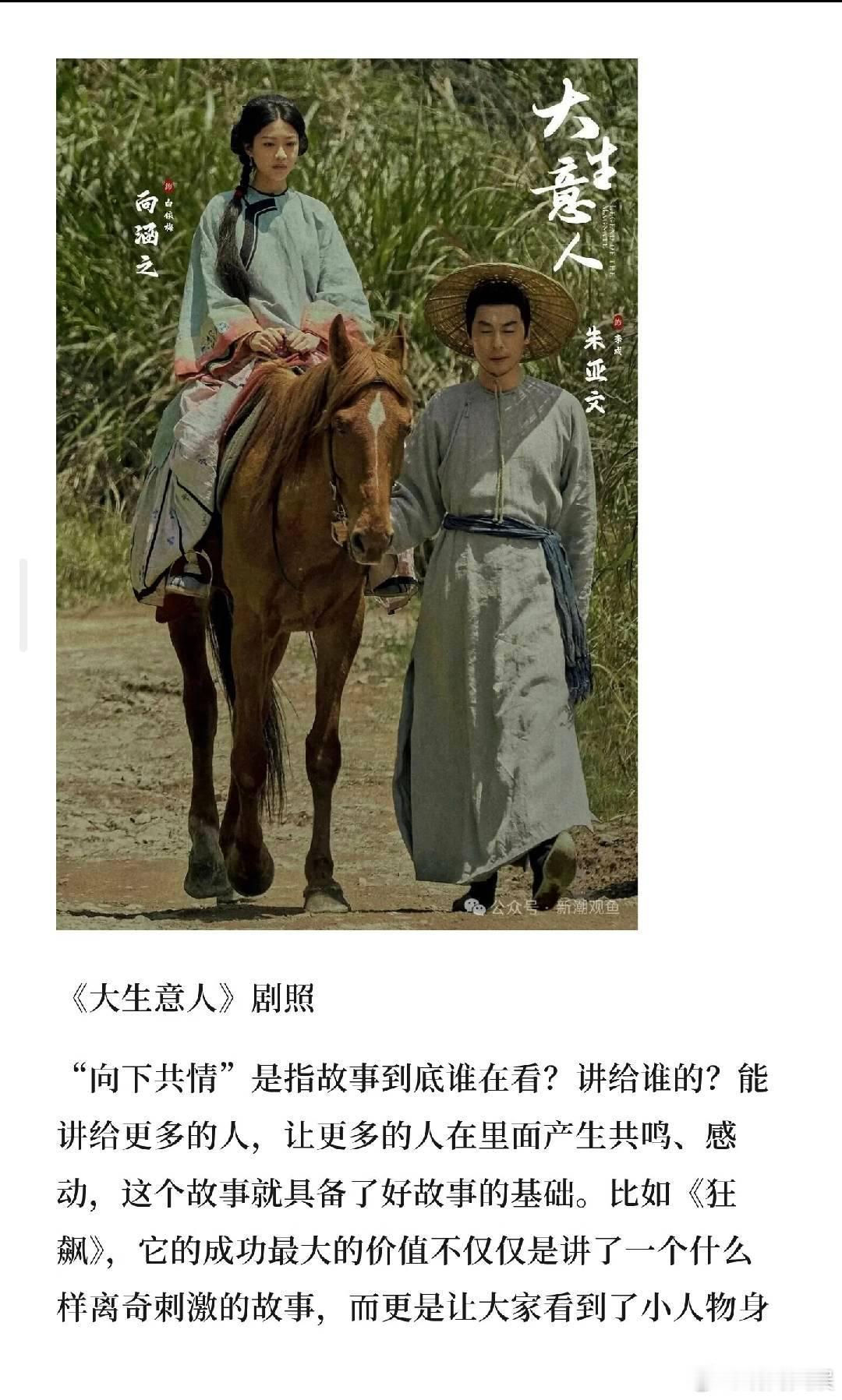 比如去年的热剧《大生意人》,题材是成熟的,但里边的人物关系、桥段情节、情感提炼有它的独特性和创新性,包括张挺导演突破自己的叙事语言,给观众不一样的作品感受,这也是创新的一种表达。