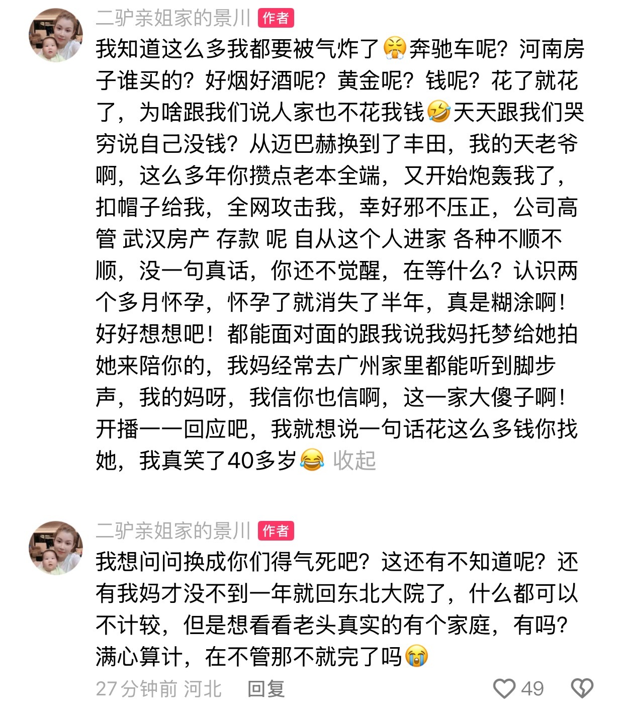 我知道这么多我都要被气炸了,奔驰车呢?河南房子谁买的?好烟好酒呢?黄金呢?钱呢?花了就花了,为啥跟我们说人家也不花我钱,天天跟我们哭穷说自己没钱?从迈巴赫换到了丰田,我的天老爷啊,这么多年你攒点老本全端,又开始炮轰我了,扣帽子给我,全网攻击我,幸好邪不压正,公司高管、武汉房产、存款呢?自从这个人进家,各种不顺不顺,没一句真话,你还不觉醒,在等什么?认识两个多月怀孕,怀孕了就消失了半年,真是糊涂啊!好好想想吧!都能面对面的跟我说我妈托梦给她拍她来陪你的,我妈经常去广州家里都能听到脚步声,我的妈呀,我信你也信啊,这一家大傻子啊!开播一一回应吧,我就想说一句话花这么多钱你找她,我真笑了,40多岁。我想问问换成你们得气死吧?这还有不知道呢?还有我妈才没不到一年就回东北大院了,什么都可以不计较,但是想看看老头真实的有个家庭,有吗?满心算计,在不管那不就完了吗?