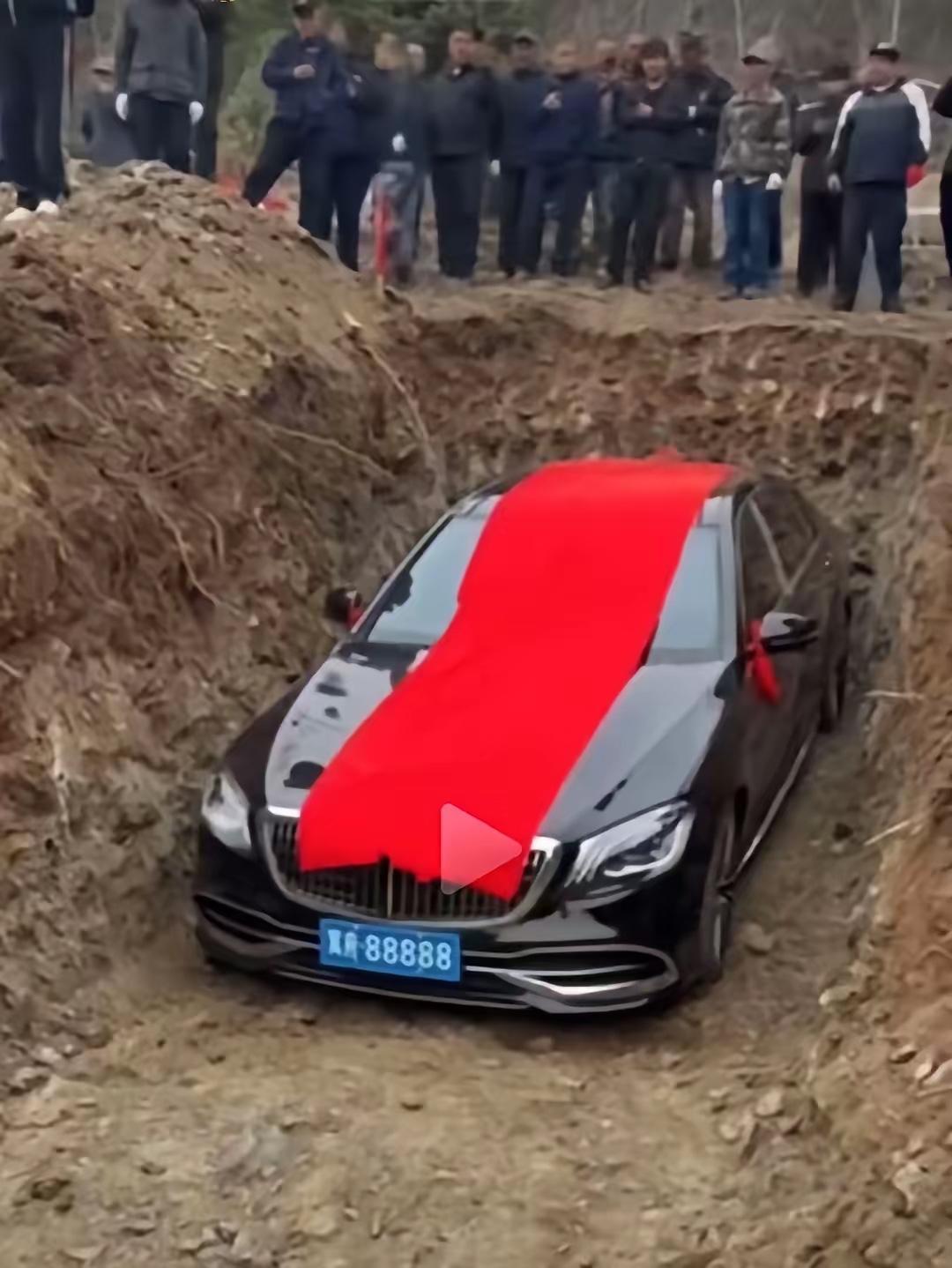 儿子也是出了名的大孝子,牢记父亲遗愿,二话不说就安排人手,还请来挖掘机专门施工,场面搞得挺大,这辆一百二十多万的豪华奔驰,就这样被深埋地下,在外人看来真的是太浪费、太可惜了。