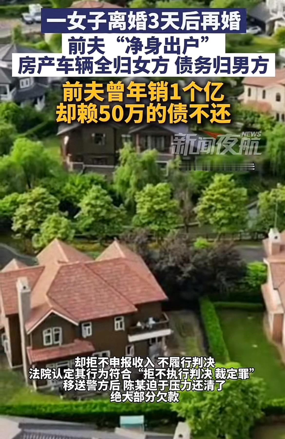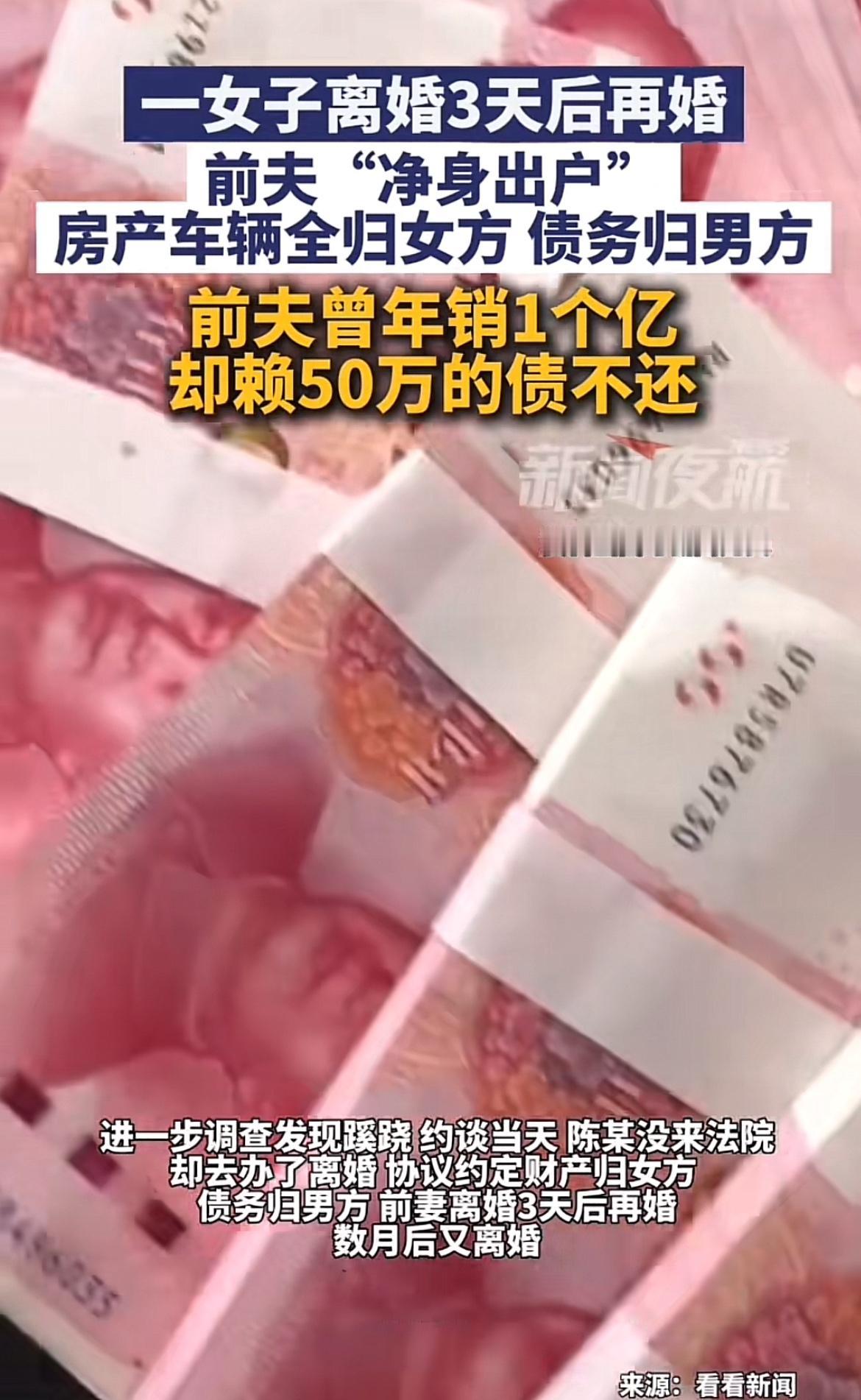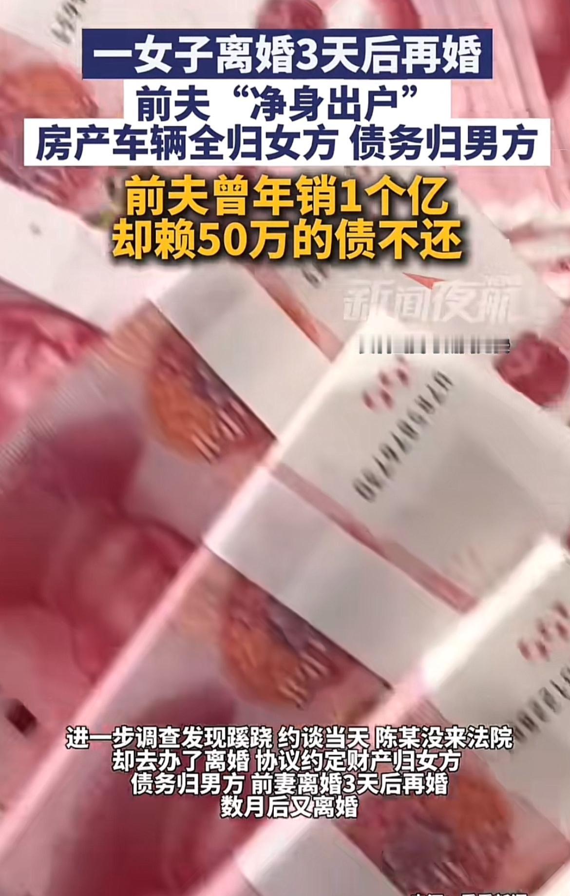 上海陈某这波操作真是让人惊掉下巴。他欠了约50万债务,法院判决后拒不归还。等法院强制执行,他玩起失踪,却跑去民政局和妻子周某离婚,净身出户,房产车辆给女方,债务自己扛。更离谱的是,周某离婚3天就再婚,几个月后又离婚。原来,陈某是为逃债,把房子先转给前妻,前妻又转给他人,卖房近七百万,钱转前妻账户做生意,还通过员工账户转移收入。最终,陈某因涉嫌拒不执行判决被立案,听说要坐牢才赶紧还了大部分欠款。这哪是什么净身出户,分明是逃债骗局,法律面前,这种小聪明可使不得!