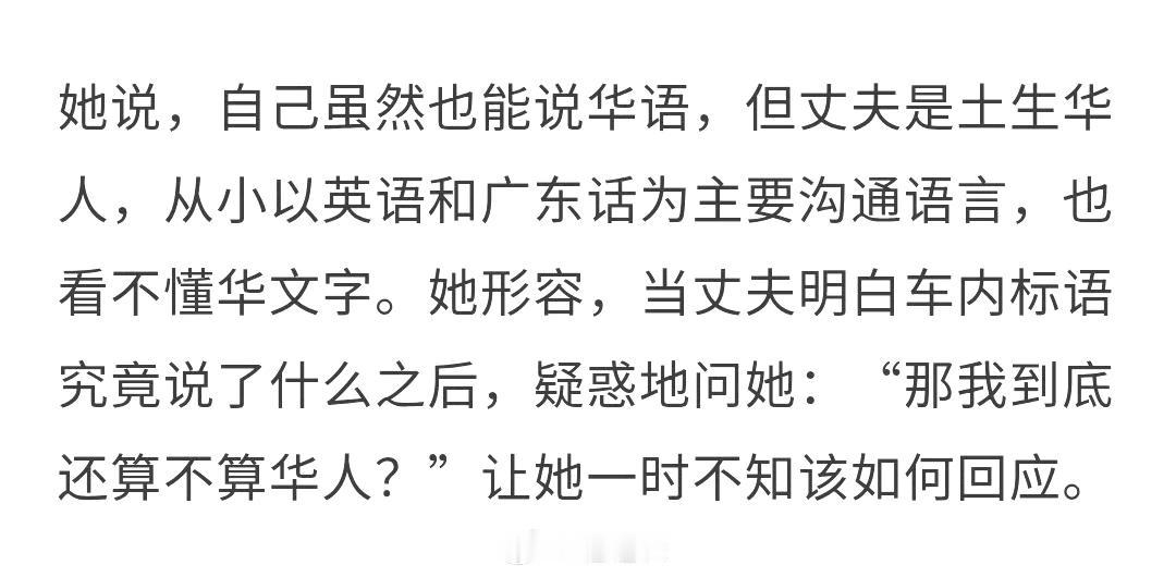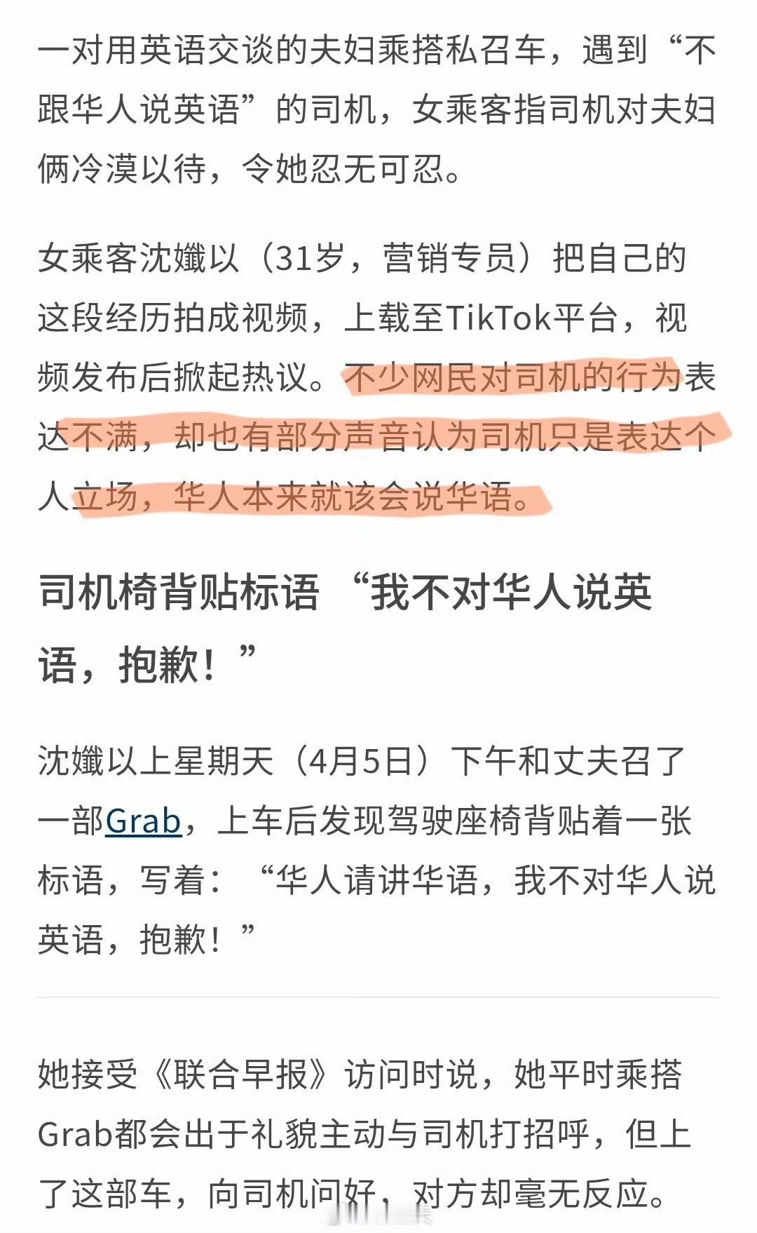 新加坡今天有个热点新闻,分享给大家:一对用英语交谈的夫妇乘搭私召车,遇到“不跟华人说英语”的司机,女乘客指司机对夫妇俩冷漠以待,令她忍无可忍。这对夫妻搞笑的是,看得懂中文提示牌,却说自己不会中文,非要自触霉头,跟司机飚英语。还有一点也很搞笑,这位沈女士说她丈夫是土生华人,却只会讲广东话和英语,看不懂中文。什么叫土生华人?这个概念有点让人摸不着头脑。