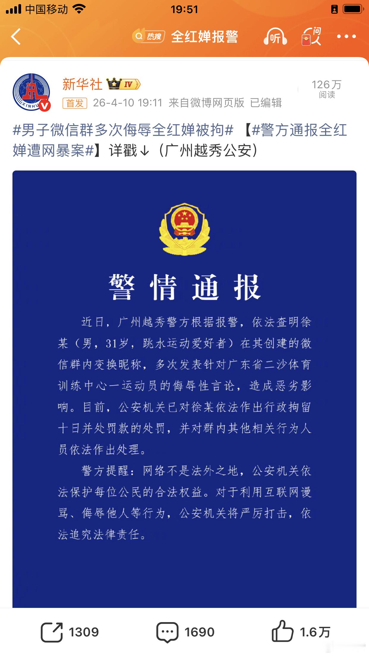 【警方通报全红婵遭网暴案】记者10日从广州越秀警方获悉,近日,越秀警方根据报警,依法查明徐某(男,31岁,跳水运动爱好者)在其创建的微信群内变换昵称,多次发表针对广东省二沙体育训练中心一运动员的侮辱性言论,造成恶劣影响。目前,公安机关已对徐某依法作出行政拘留十日并处罚款的处罚,并对群内其他相关行为人员依法作出处理。(记者:毛鑫)