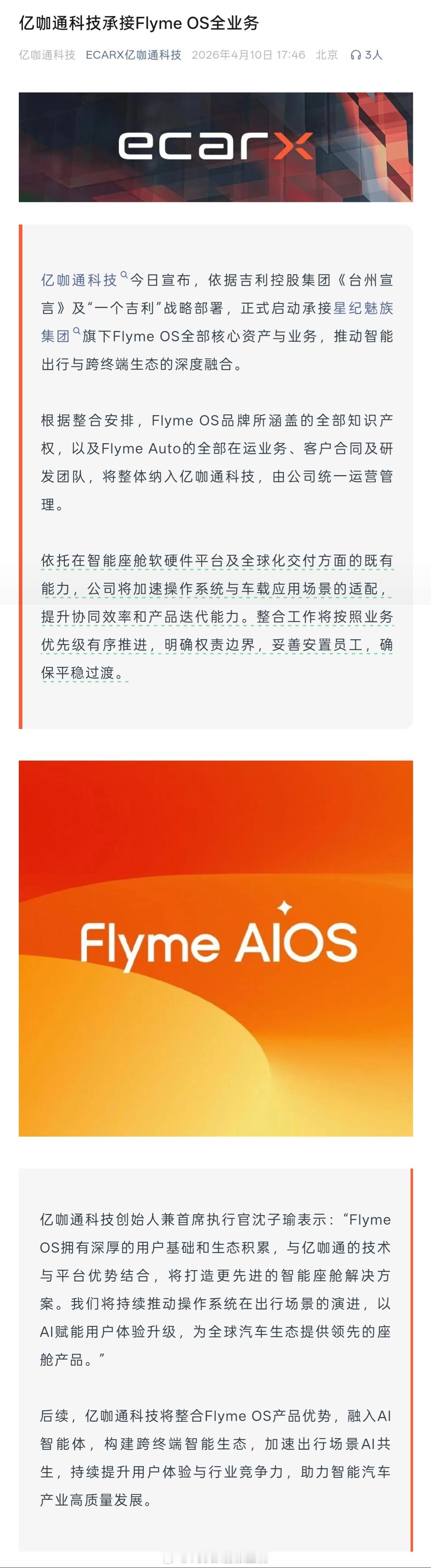 亿咖通今日正式发布公告:正式启动承接星纪魅族集团旗下 Flyme OS 全部核心资产与业务,Flyme OS 品牌所涵盖的全部知识产权,以及 Flyme Auto 的全部在运业务、客户合同及研发团队,将整体纳入亿咖通科技,由公司统一运营管理。