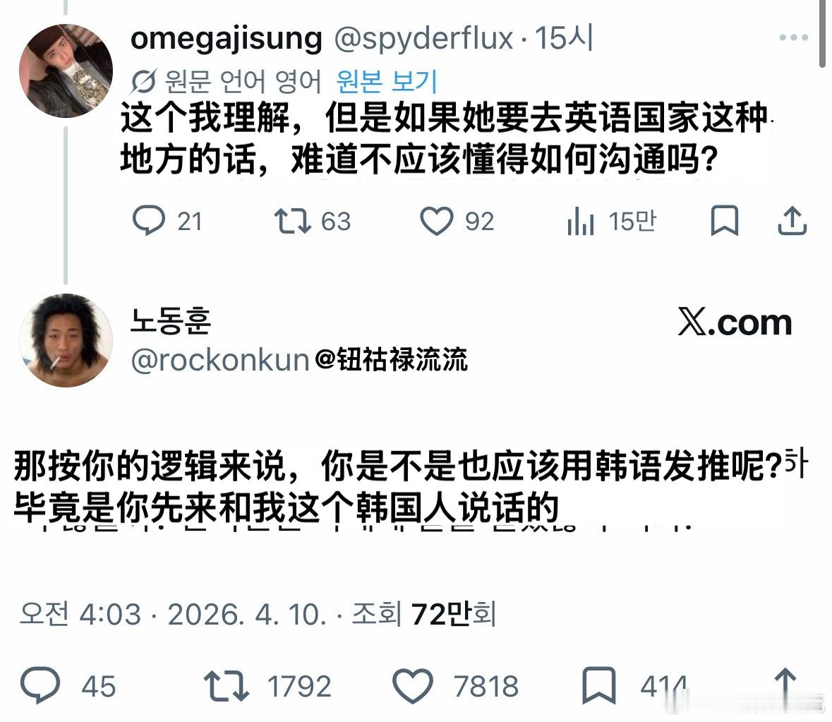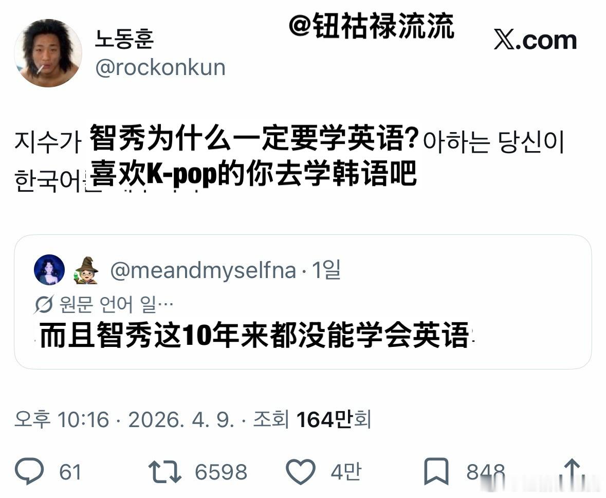 【热帖】在外国粉丝中很受欢迎的韩国推文起因是有人用英语吐槽KPOP爱豆不学英语,hgr回怼:为什么学英语,喜欢KPOP你去学韩语吧后面有人用英语回:如果去英语国家的话,不应该要懂得如何沟通吗?然后这位hgr再次回怼:按你的逻辑你是不是也要用韩语发推,毕竟是你先来和我这个说话的