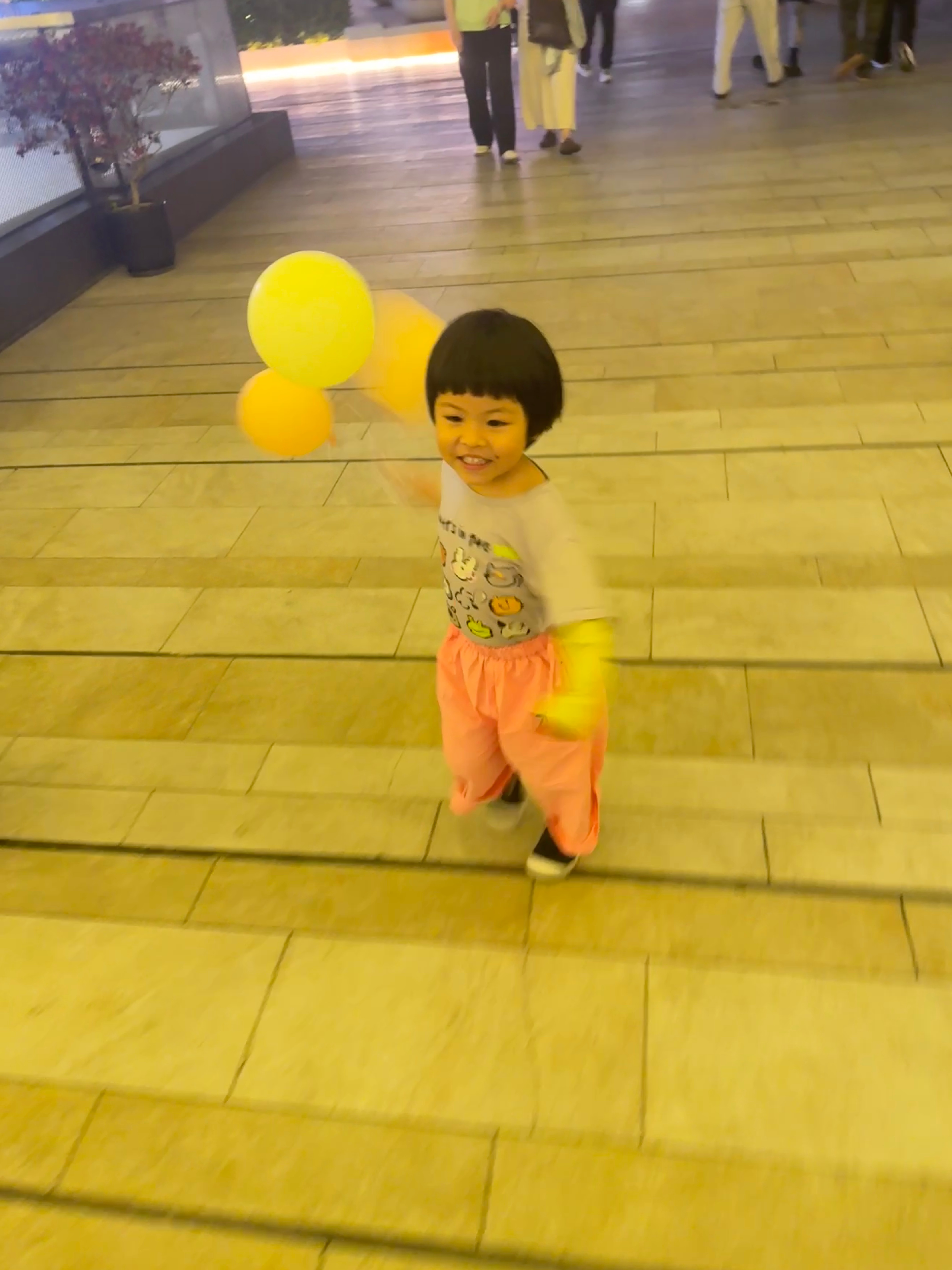 吃完饭要走了,看到店员在拆另一桌的生日装饰,球宝跑过去看气球,又问人家服务员:气球可以给我王吗?