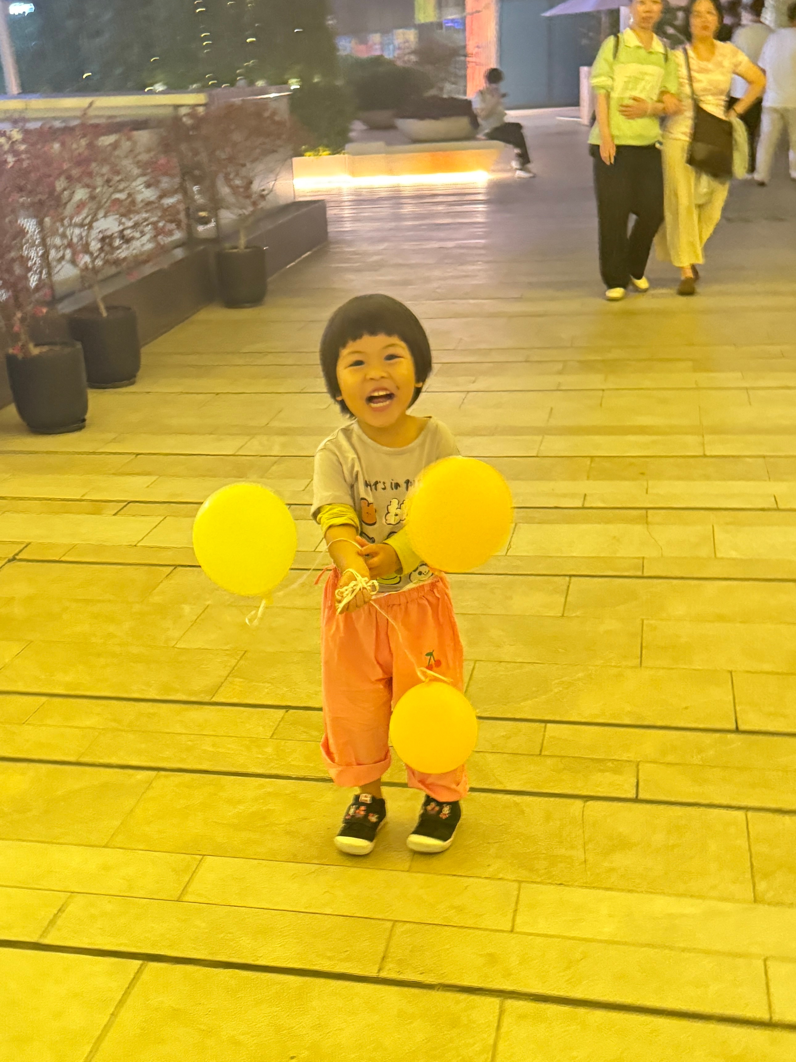 吃完饭要走了,看到店员在拆另一桌的生日装饰,球宝跑过去看气球,又问人家服务员:气