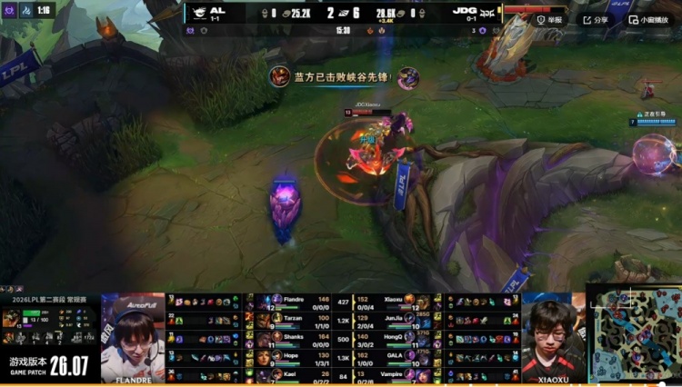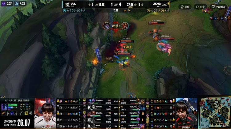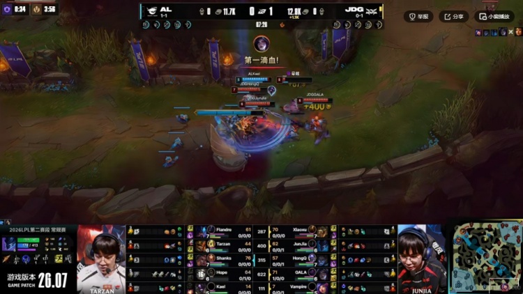 [7:26]AL上野包上强杀xiaoxu鳄鱼失败,反而是Junjia梦魇同步关灯开飞包下,JDG四越二强行击杀掉了Hope希维尔!虽然Vampire妮蔻被换掉,但是GALA卡莎拿下一血!
