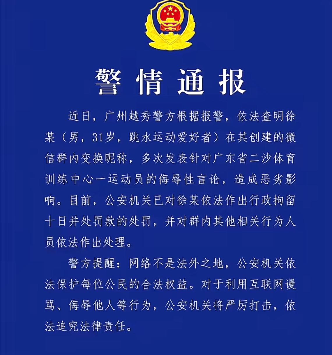 就在4月10日广州的帽子叔叔,对这起事件发布了情况通报,依法查明男子徐某,也就是之前网上曝出的名为“水花征服者联盟”的群的群主,这个徐某是一名跳水爱好者,他在自己所建的群内变换昵称,多次发表针对全红婵的侮辱性言论,鉴于这起事件的恶劣影响性,对其做出了行政拘留10日的处罚,与此同时其他的相关人员,也不同程度地受到了处分。