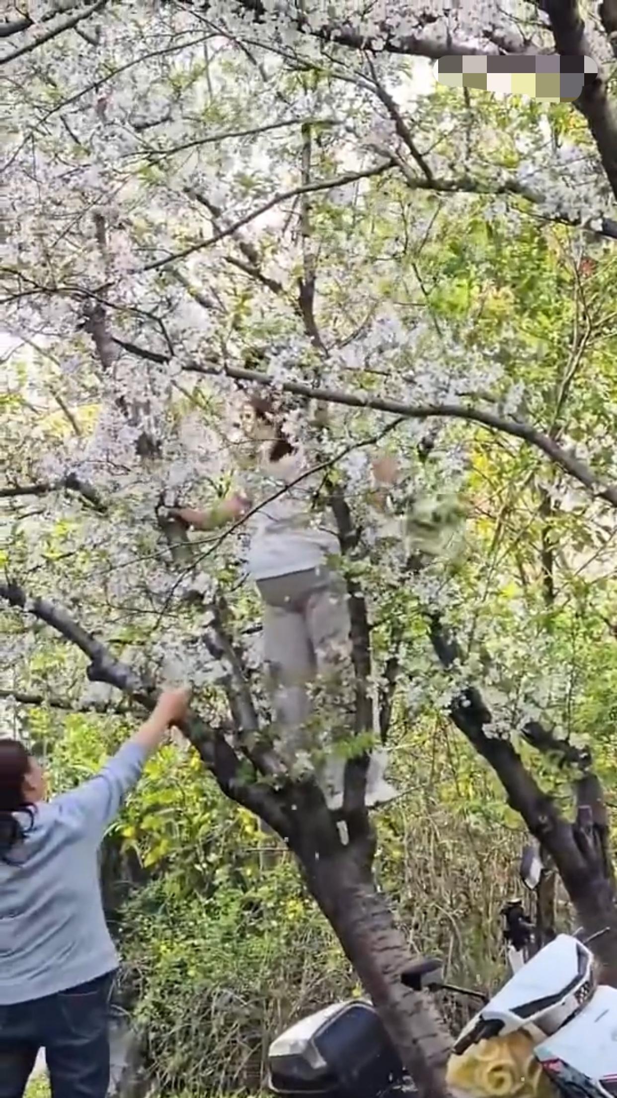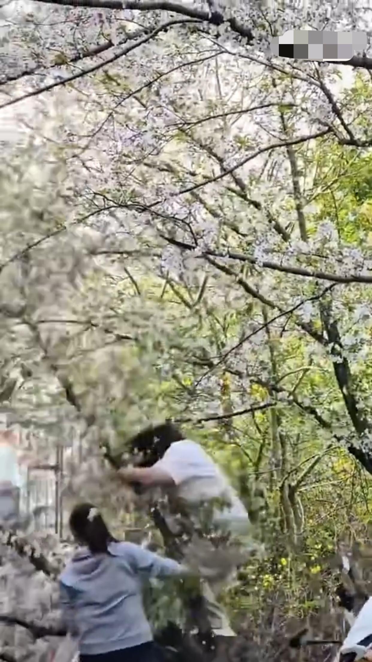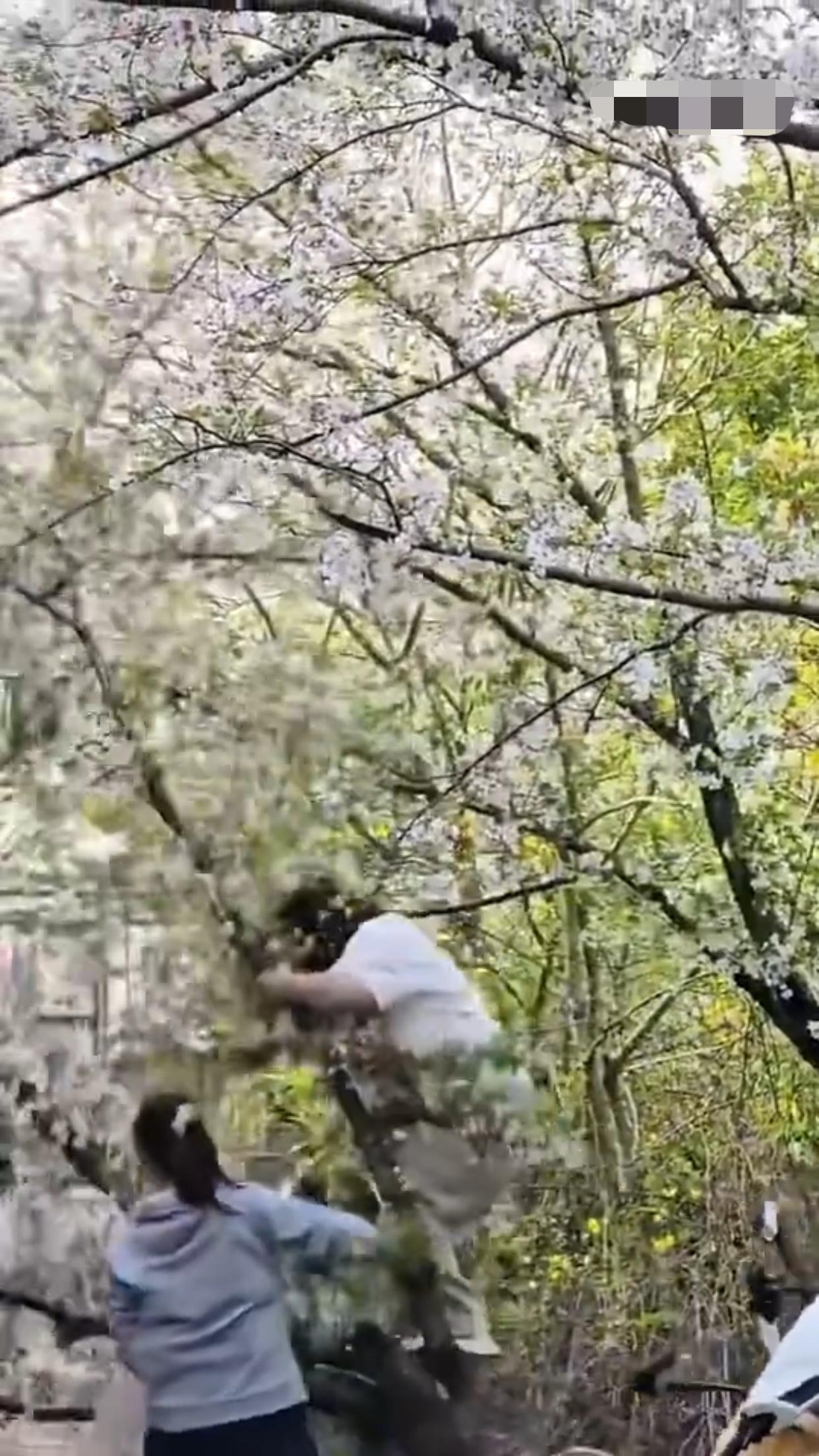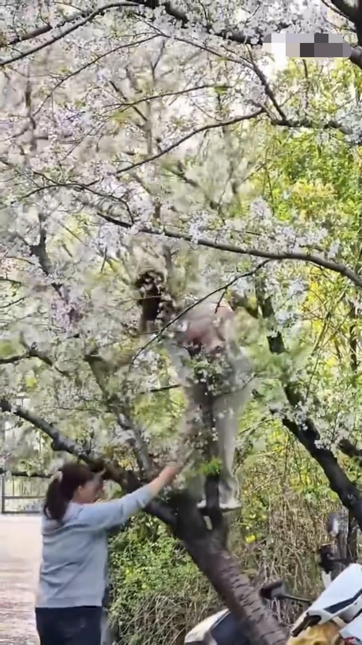 上海的这棵樱花树,本来是“花开正艳”,然而却有“千金(斤)大小姐”非要爬到树上去