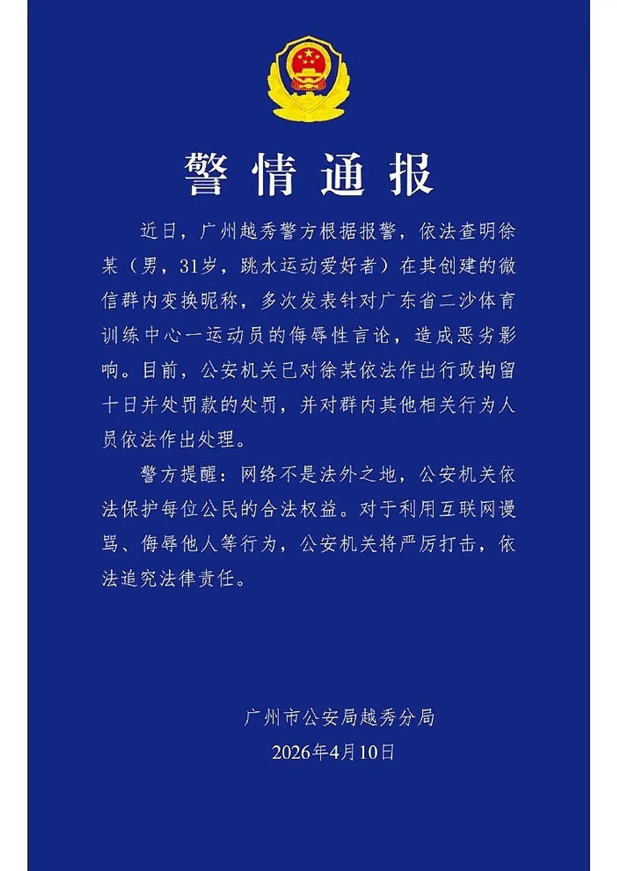 据了解,31岁的徐某是个跳水运动爱好者,从2022年开始组建了百人群,拉拢运动员、裁判、记者等业内人员,长期在群内发布恶毒言论,肆意侮辱诋毁为国争光的小将,行为极其恶劣。