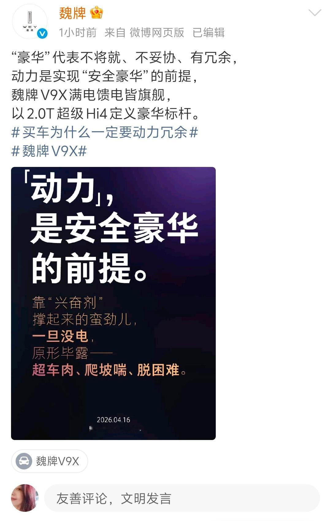 这次魏牌V9X以2.0T超级Hi4能做到满电零百4.6秒、馈电零百4.7秒,重点是馈电也不疲软。还有2.0T 混动 + 前后双电机 + 4 挡 DHT,800V 超充 综合505kW!而且资料显示在极限馈电状态下依旧能稳定输出最高233km/h的极速,动力输出和满电几乎没有差距。这才是豪华车该匹配的动力。下周就是归元S技术发布会了,还挺期待的买车为什么一定要有动力冗余魏牌V9X