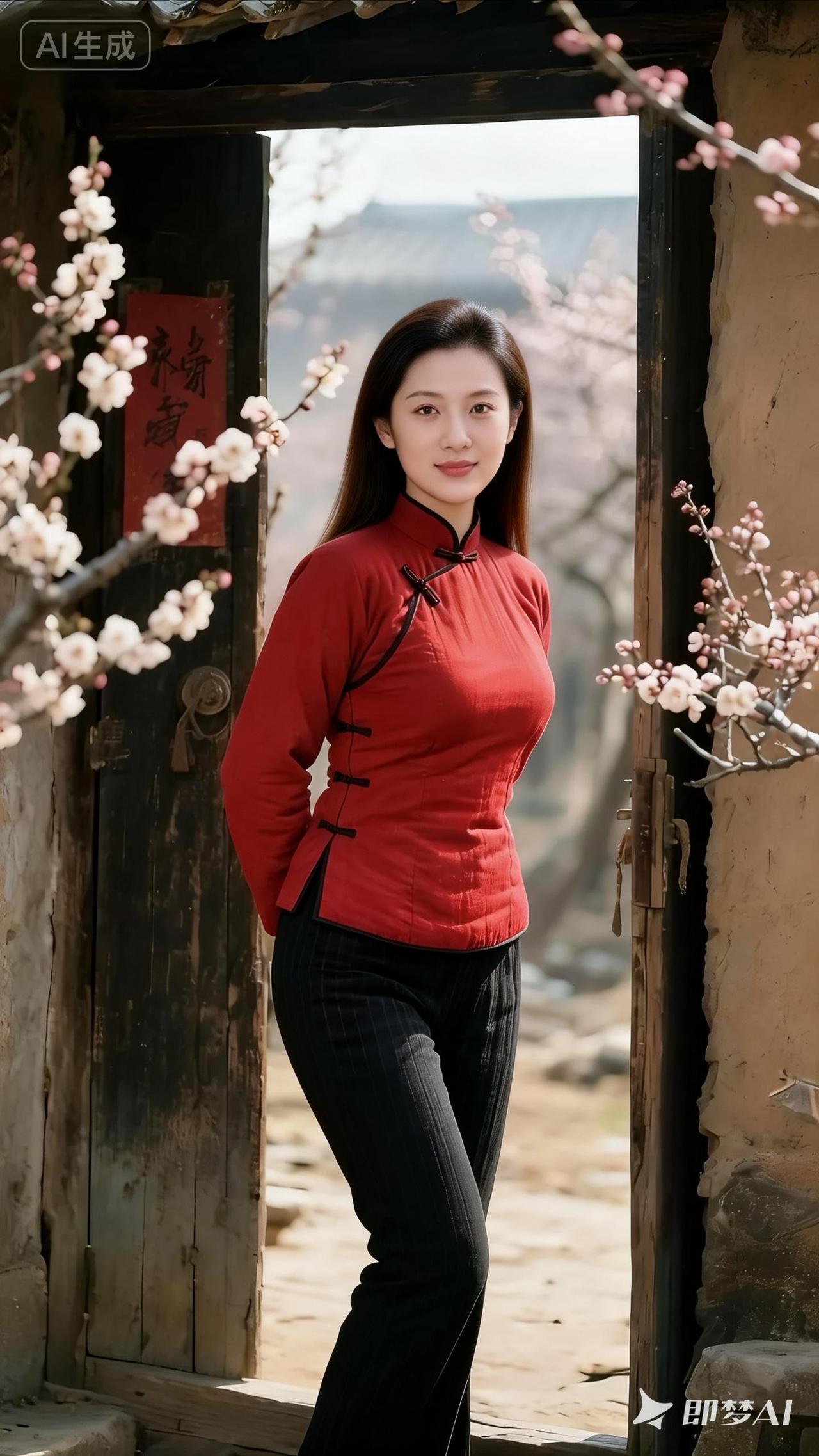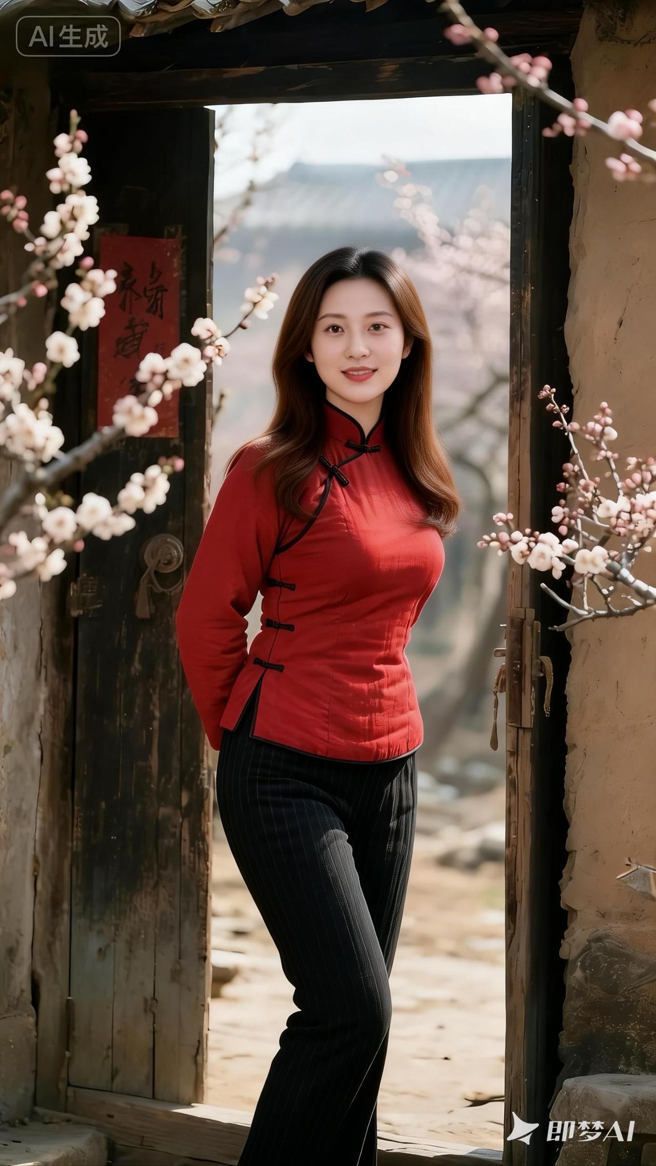 古风少女,红衣飘飘,桃花树下,春意盎然。