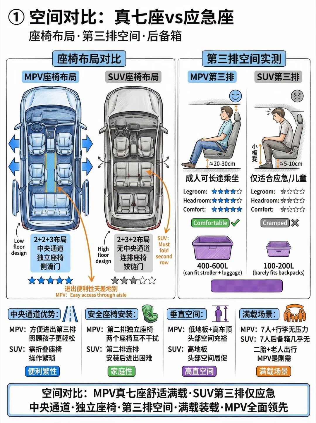 SUV能替一部分MPV的场景,但替不了核心体验。SUV更像全能选手,平时自己开不像个司机,偶尔拉上全家也能顶一顶。但如果家里真有老人、小孩,还经常满员出行,MPV那种低地台、上下车方便、第三排真能坐、长途更舒服的优势,SUV很难完全补上。