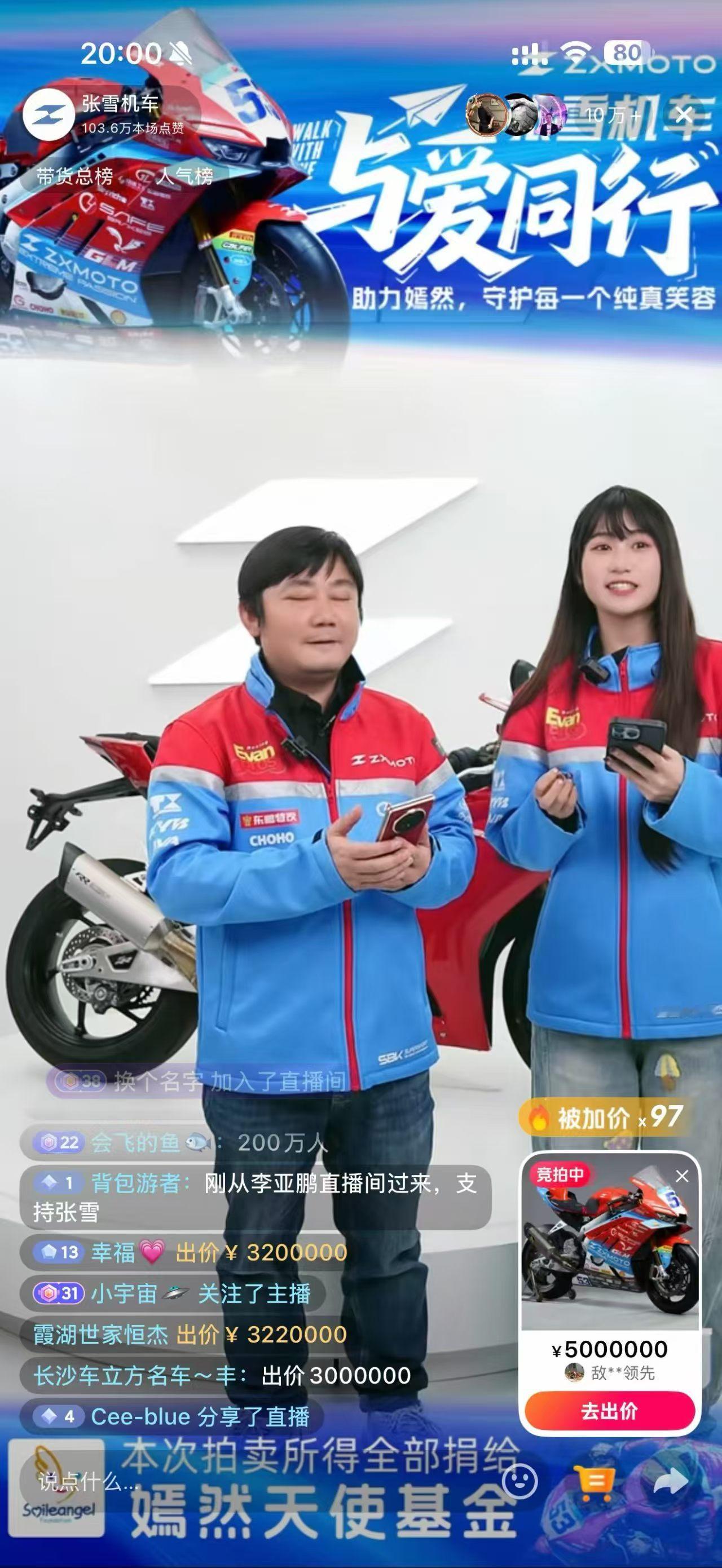 张雪机车直播不到一分钟,拍卖到了500万封顶价!张雪